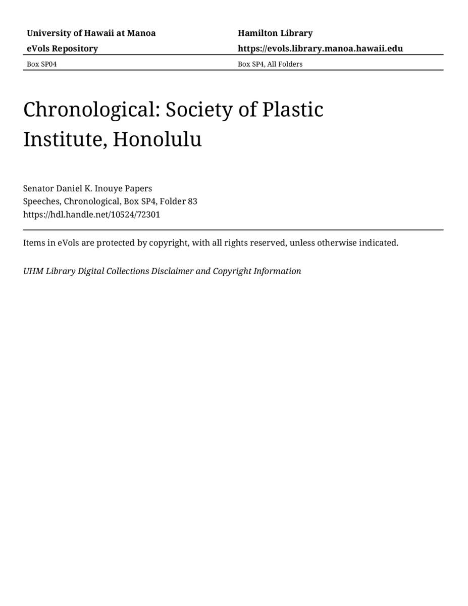 Society of Plastic Institute, Honolulu, May 15, 1981, MANUSCRIPT-HCPC00011, Speeches, Chronological, Box SP4, Folder 83, Senator Daniel K. Inouye Papers, Hawaiʻi Congressional Papers Collection, University of Hawaiʻi at Mānoa Library, Honolulu, HI. https://omekas-congress.lib.wvu.edu/catalog/10524_72301 (accessed April 21, 2026).