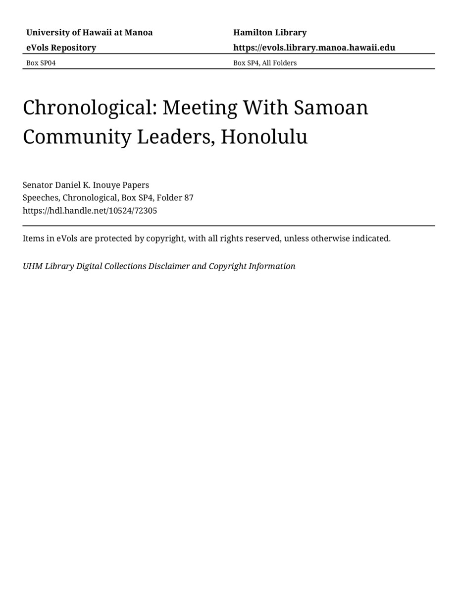 Meeting With Samoan Community Leaders, Honolulu, June 6, 1981, MANUSCRIPT-HCPC00011, Speeches, Chronological, Box SP4, Folder 87, Senator Daniel K. Inouye Papers, Hawaiʻi Congressional Papers Collection, University of Hawaiʻi at Mānoa Library, Honolulu, HI. https://omekas-congress.lib.wvu.edu/catalog/10524_72305 (accessed April 21, 2026).