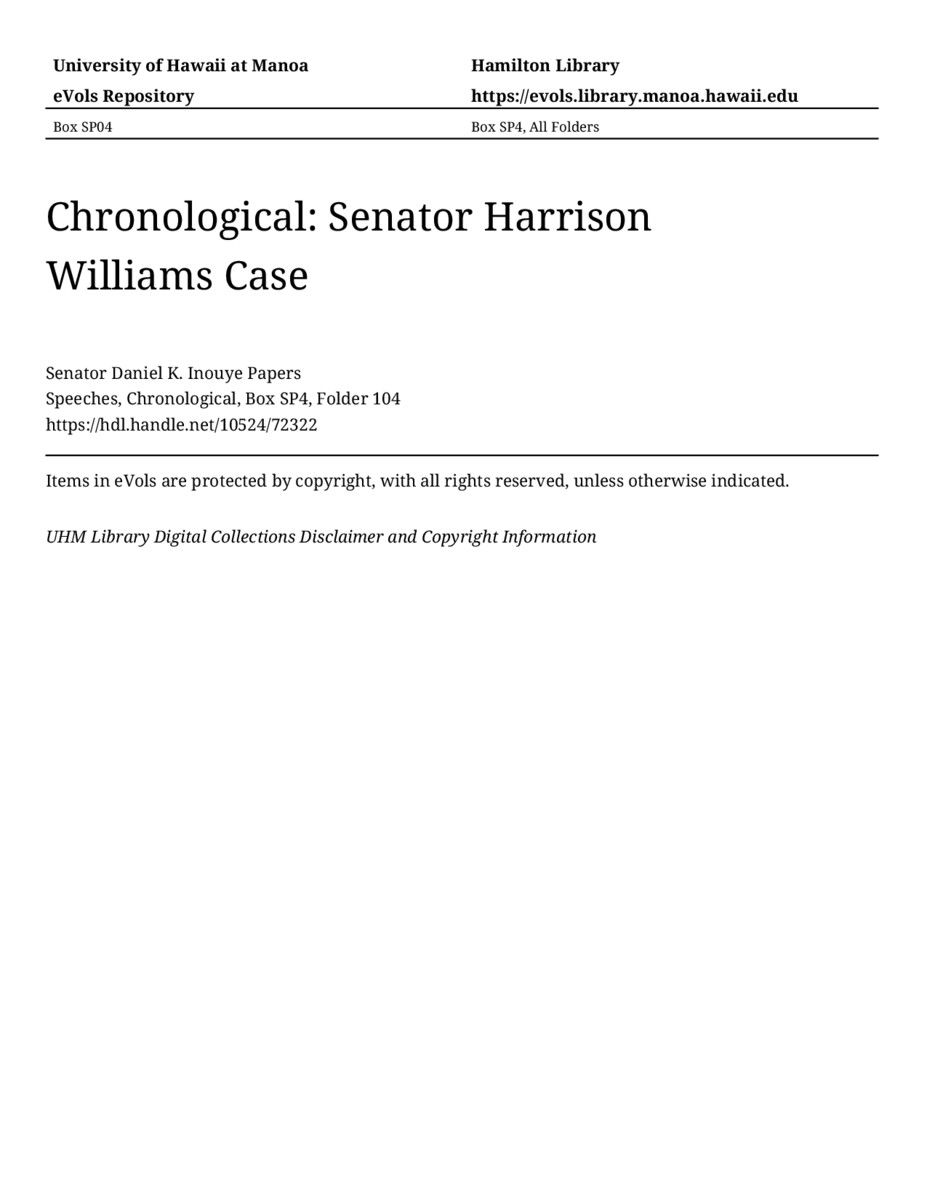 Senator Harrison Williams Case, March 25, 1982, MANUSCRIPT-HCPC00011, Speeches, Chronological, Box SP4, Folder 104, Senator Daniel K. Inouye Papers, Hawaiʻi Congressional Papers Collection, University of Hawaiʻi at Mānoa Library, Honolulu, HI. https://omekas-congress.lib.wvu.edu/catalog/10524_72322 (accessed April 20, 2026).