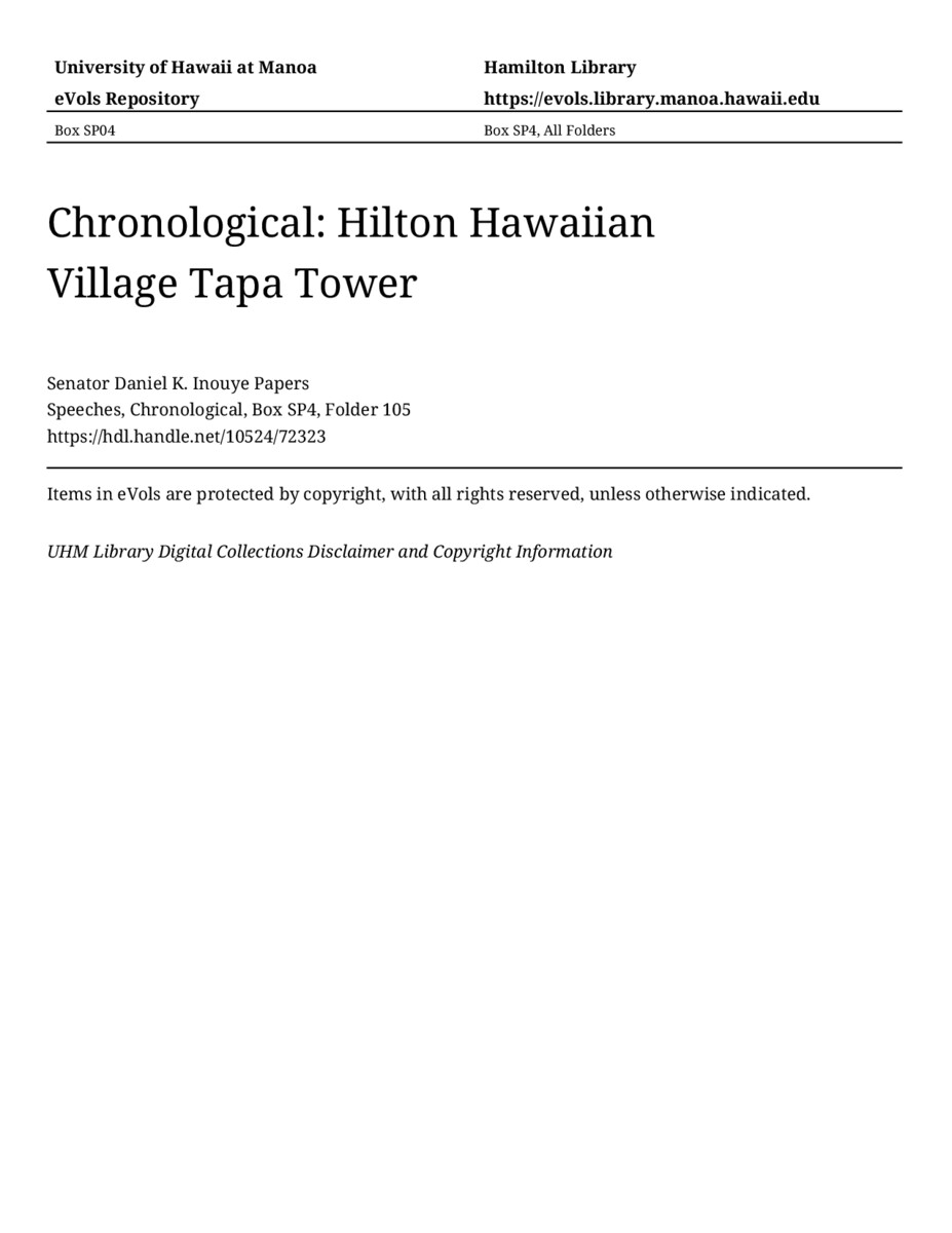 Hilton Hawaiian Village Tapa Tower, March 26, 1982, MANUSCRIPT-HCPC00011, Speeches, Chronological, Box SP4, Folder 105, Senator Daniel K. Inouye Papers, Hawaiʻi Congressional Papers Collection, University of Hawaiʻi at Mānoa Library, Honolulu, HI. https://omekas-congress.lib.wvu.edu/catalog/10524_72323 (accessed April 19, 2026).