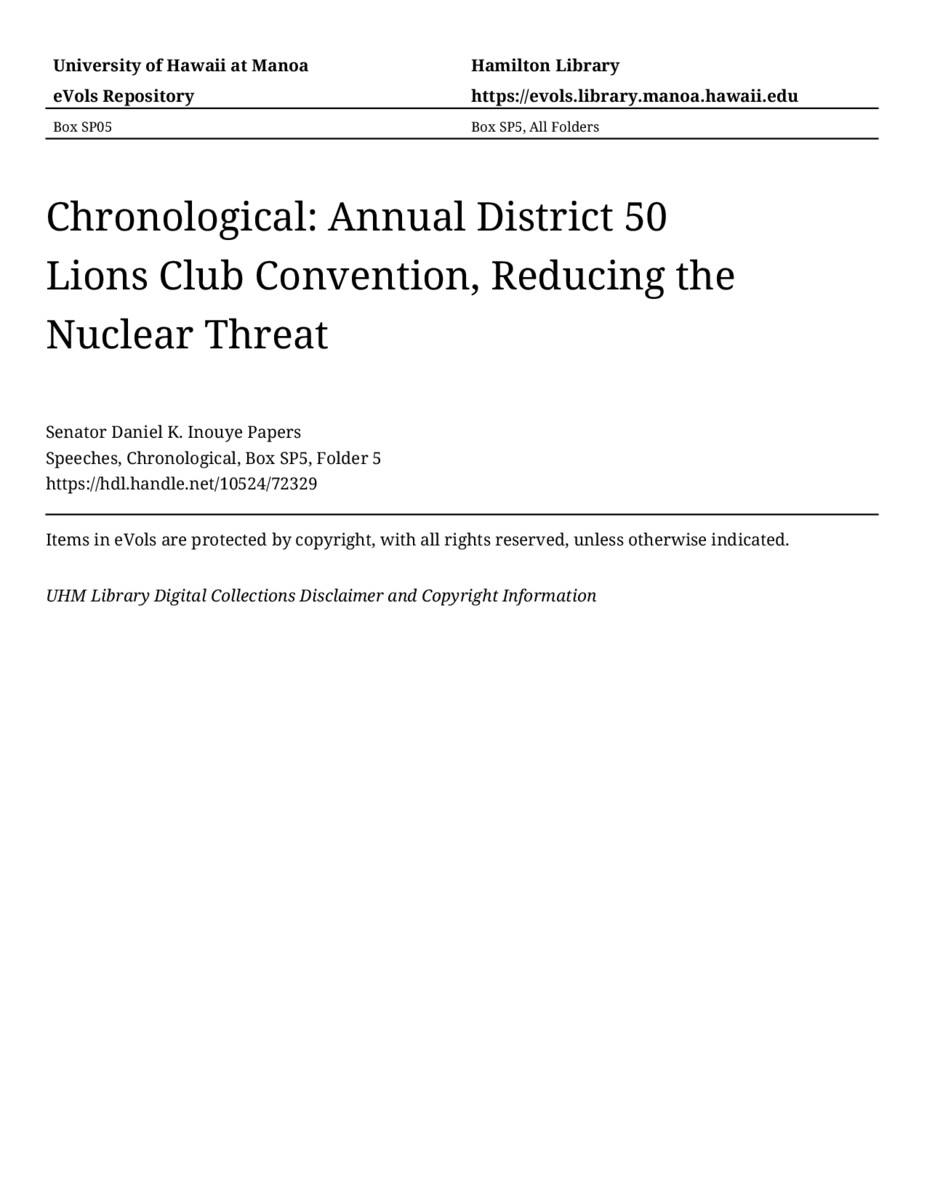 - Annual District 50 Lions Club Convention, Reducing the Nuclear Threat