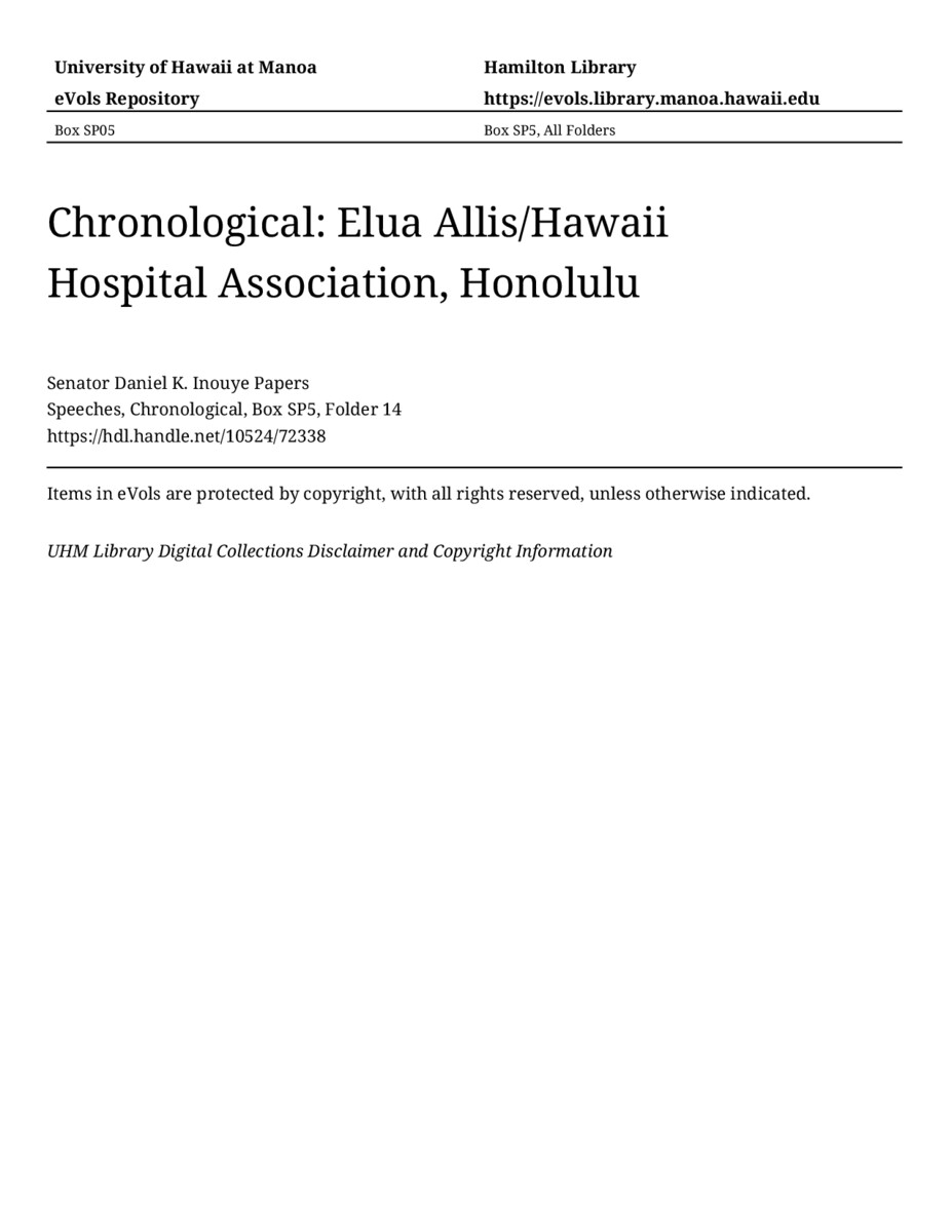 Elua Allis/Hawaii Hospital Association, Honolulu, June 4, 1982, MANUSCRIPT-HCPC00011, Speeches, Chronological, Box SP5, Folder 14, Senator Daniel K. Inouye Papers, Hawaiʻi Congressional Papers Collection, University of Hawaiʻi at Mānoa Library, Honolulu, HI. https://omekas-congress.lib.wvu.edu/catalog/10524_72338 (accessed April 17, 2026).