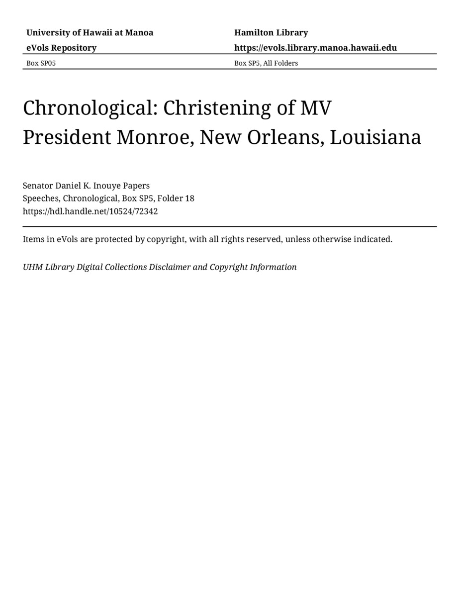 Christening of MV President Monroe, New Orleans, Louisiana, August 21, 1982, MANUSCRIPT-HCPC00011, Speeches, Chronological, Box SP5, Folder 18, Senator Daniel K. Inouye Papers, Hawaiʻi Congressional Papers Collection, University of Hawaiʻi at Mānoa Library, Honolulu, HI. https://omekas-congress.lib.wvu.edu/catalog/10524_72342 (accessed April 17, 2026).