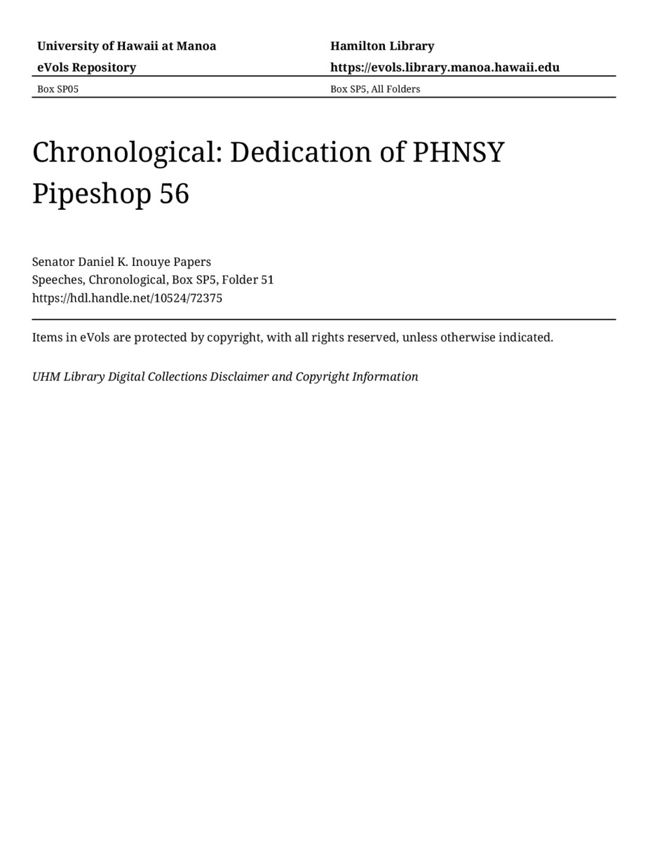 Dedication of PHNSY Pipeshop 56, July 5, 1983, MANUSCRIPT-HCPC00011, Speeches, Chronological, Box SP5, Folder 51, Senator Daniel K. Inouye Papers, Hawaiʻi Congressional Papers Collection, University of Hawaiʻi at Mānoa Library, Honolulu, HI. https://omekas-congress.lib.wvu.edu/catalog/10524_72375 (accessed April 10, 2026).