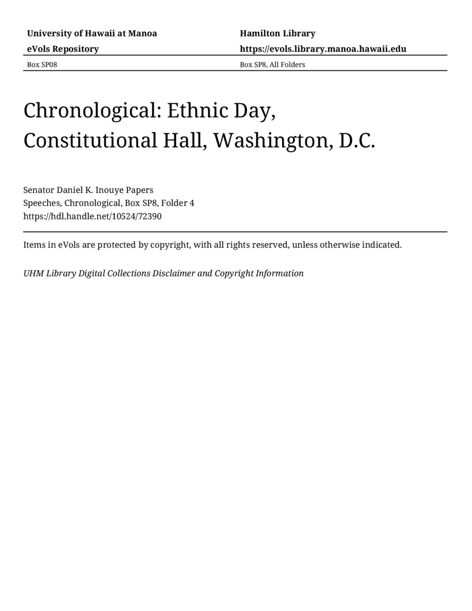 Ethnic Day, Constitutional Hall, Washington, D.C., September 21, 1986, MANUSCRIPT-HCPC00011, Speeches, Chronological, Box SP8, Folder 4, Senator Daniel K. Inouye Papers, Hawaiʻi Congressional Papers Collection, University of Hawaiʻi at Mānoa Library, Honolulu, HI. https://omekas-congress.lib.wvu.edu/catalog/10524_72390 (accessed April 10, 2026).