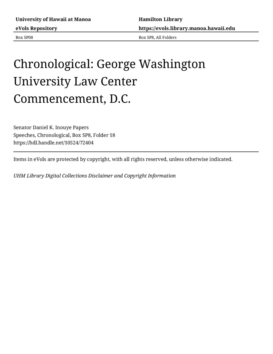 George Washington University Law Center Commencement, D.C., May 17, 1987, MANUSCRIPT-HCPC00011, Speeches, Chronological, Box SP8, Folder 18, Senator Daniel K. Inouye Papers, Hawaiʻi Congressional Papers Collection, University of Hawaiʻi at Mānoa Library, Honolulu, HI. https://omekas-congress.lib.wvu.edu/catalog/10524_72404 (accessed April 18, 2026).