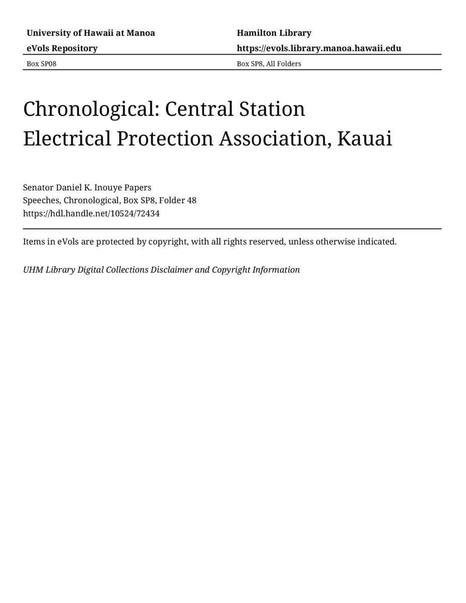 Central Station Electrical Protection Association, Kauai, October 24, 1988, MANUSCRIPT-HCPC00011, Speeches, Chronological, Box SP8, Folder 48, Senator Daniel K. Inouye Papers, Hawaiʻi Congressional Papers Collection, University of Hawaiʻi at Mānoa Library, Honolulu, HI. https://omekas-congress.lib.wvu.edu/catalog/10524_72434 (accessed April 20, 2026).