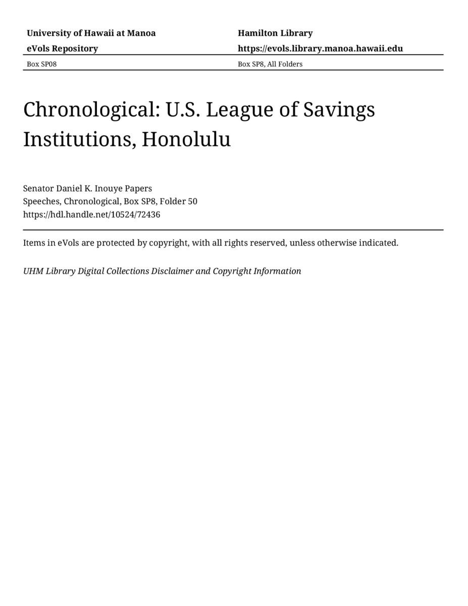 U.S. League of Savings Institutions, Honolulu, October 31, 1988, MANUSCRIPT-HCPC00011, Speeches, Chronological, Box SP8, Folder 50, Senator Daniel K. Inouye Papers, Hawaiʻi Congressional Papers Collection, University of Hawaiʻi at Mānoa Library, Honolulu, HI. https://omekas-congress.lib.wvu.edu/catalog/10524_72436 (accessed April 20, 2026).