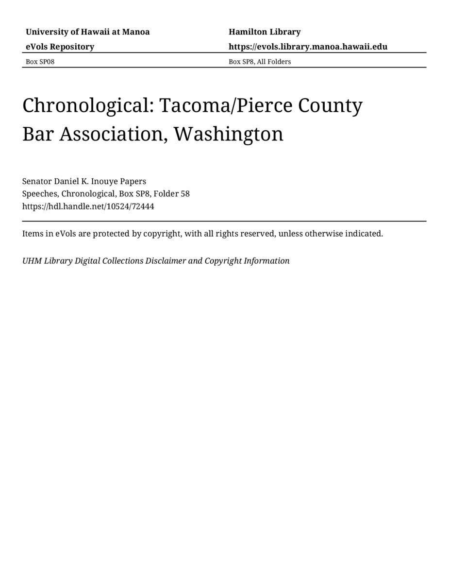 Tacoma/Pierce County Bar Association, Washington, February 10, 1989, MANUSCRIPT-HCPC00011, Speeches, Chronological, Box SP8, Folder 58, Senator Daniel K. Inouye Papers, Hawaiʻi Congressional Papers Collection, University of Hawaiʻi at Mānoa Library, Honolulu, HI. https://omekas-congress.lib.wvu.edu/catalog/10524_72444 (accessed April 16, 2026).