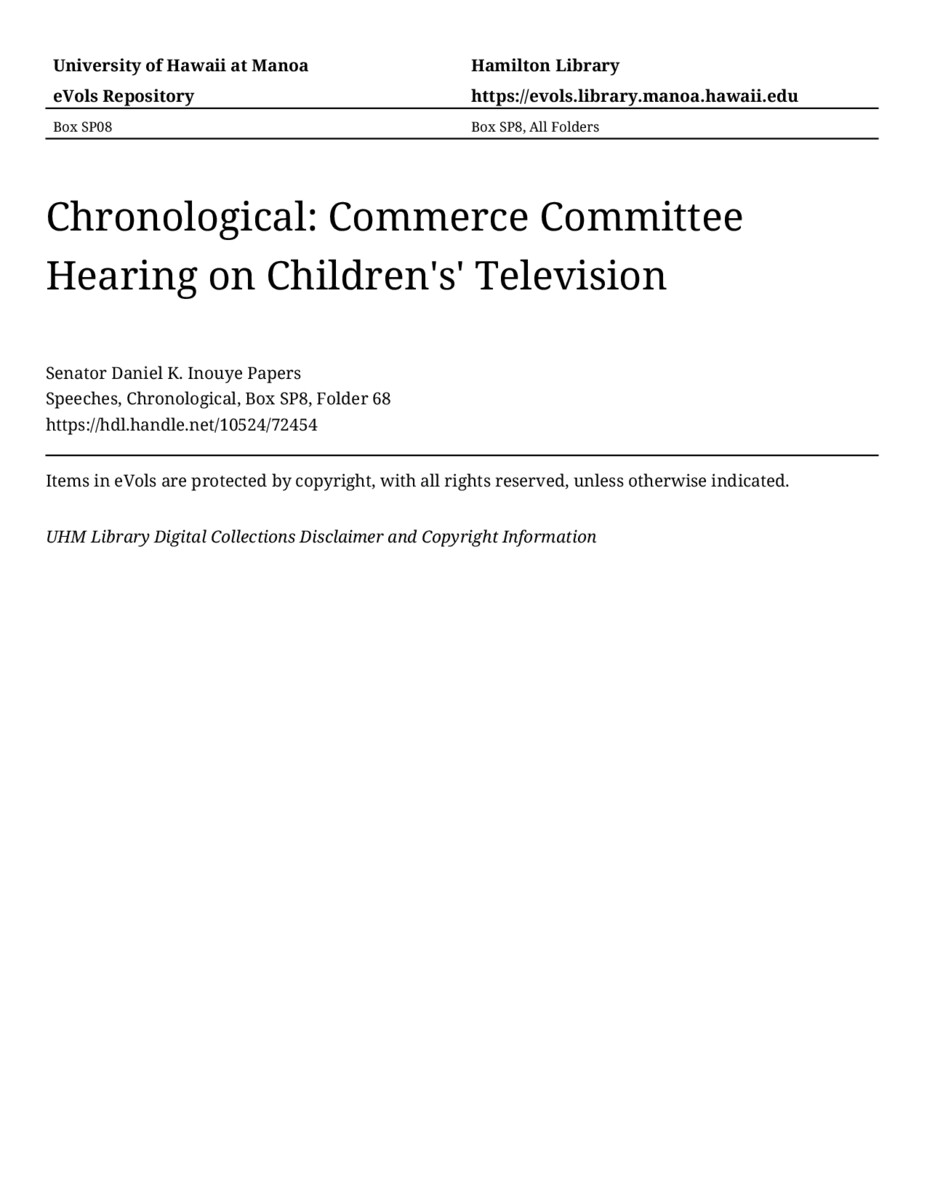 Commerce Committee Hearing on Children's' Television, July 12, 1989, MANUSCRIPT-HCPC00011, Speeches, Chronological, Box SP8, Folder 68, Senator Daniel K. Inouye Papers, Hawaiʻi Congressional Papers Collection, University of Hawaiʻi at Mānoa Library, Honolulu, HI. https://omekas-congress.lib.wvu.edu/catalog/10524_72454 (accessed April 09, 2026).