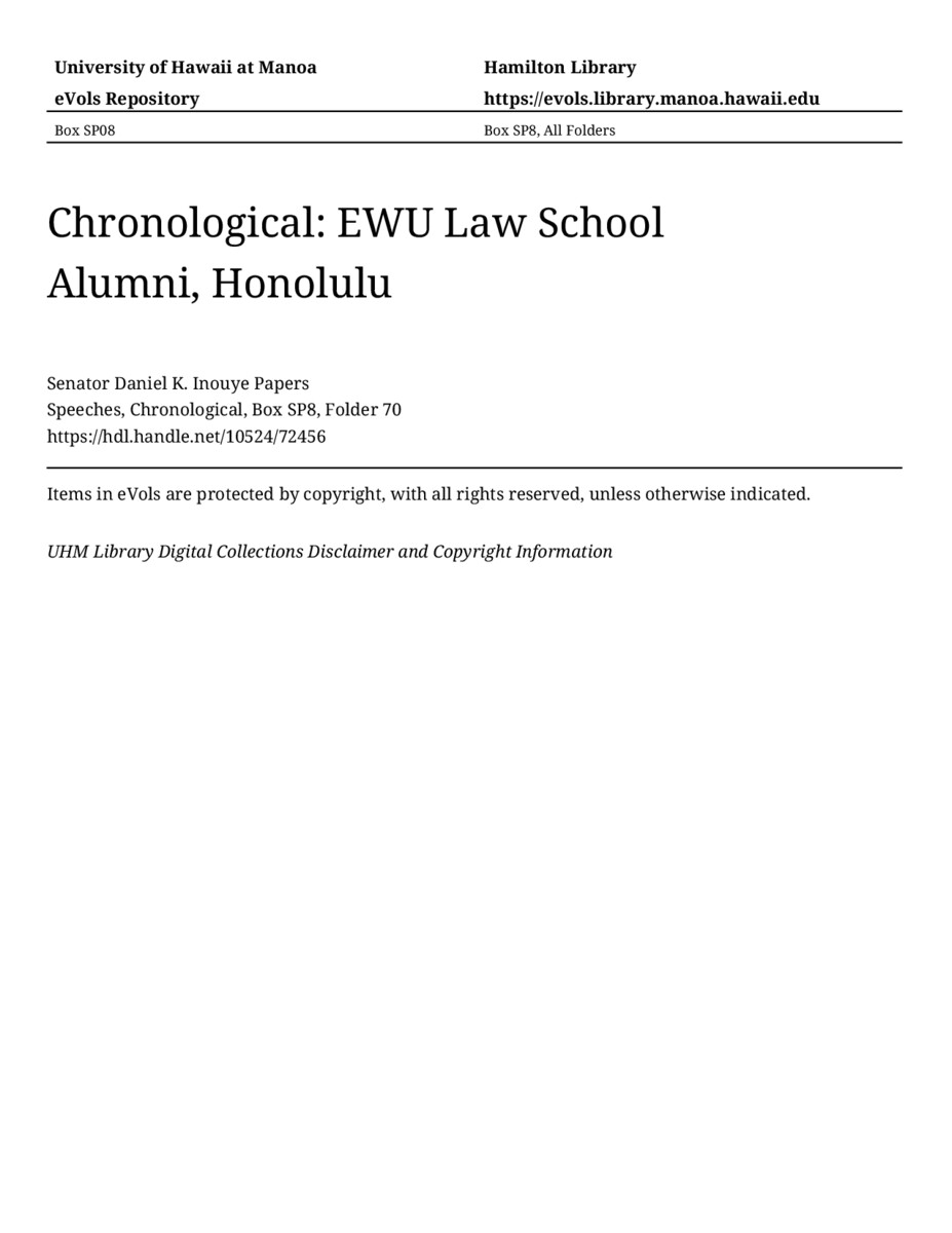 EWU Law School Alumni, Honolulu, August 7, 1989, MANUSCRIPT-HCPC00011, Speeches, Chronological, Box SP8, Folder 70, Senator Daniel K. Inouye Papers, Hawaiʻi Congressional Papers Collection, University of Hawaiʻi at Mānoa Library, Honolulu, HI. https://omekas-congress.lib.wvu.edu/catalog/10524_72456 (accessed April 22, 2026).