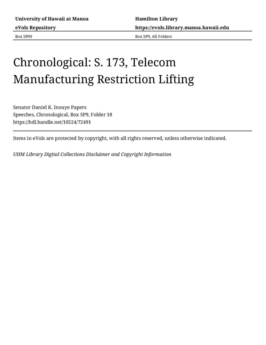 S. 173, Telecom Manufacturing Restriction Lifting, February 26, 1991, MANUSCRIPT-HCPC00011, Speeches, Chronological, Box SP9, Folder 18, Senator Daniel K. Inouye Papers, Hawaiʻi Congressional Papers Collection, University of Hawaiʻi at Mānoa Library, Honolulu, HI. https://omekas-congress.lib.wvu.edu/catalog/10524_72491 (accessed April 09, 2026).