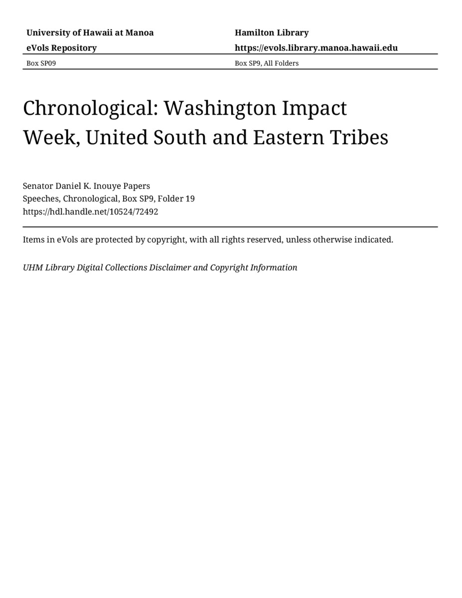 Washington Impact Week, United South and Eastern Tribes, February 27, 1991, MANUSCRIPT-HCPC00011, Speeches, Chronological, Box SP9, Folder 19, Senator Daniel K. Inouye Papers, Hawaiʻi Congressional Papers Collection, University of Hawaiʻi at Mānoa Library, Honolulu, HI. https://omekas-congress.lib.wvu.edu/catalog/10524_72492 (accessed April 20, 2026).