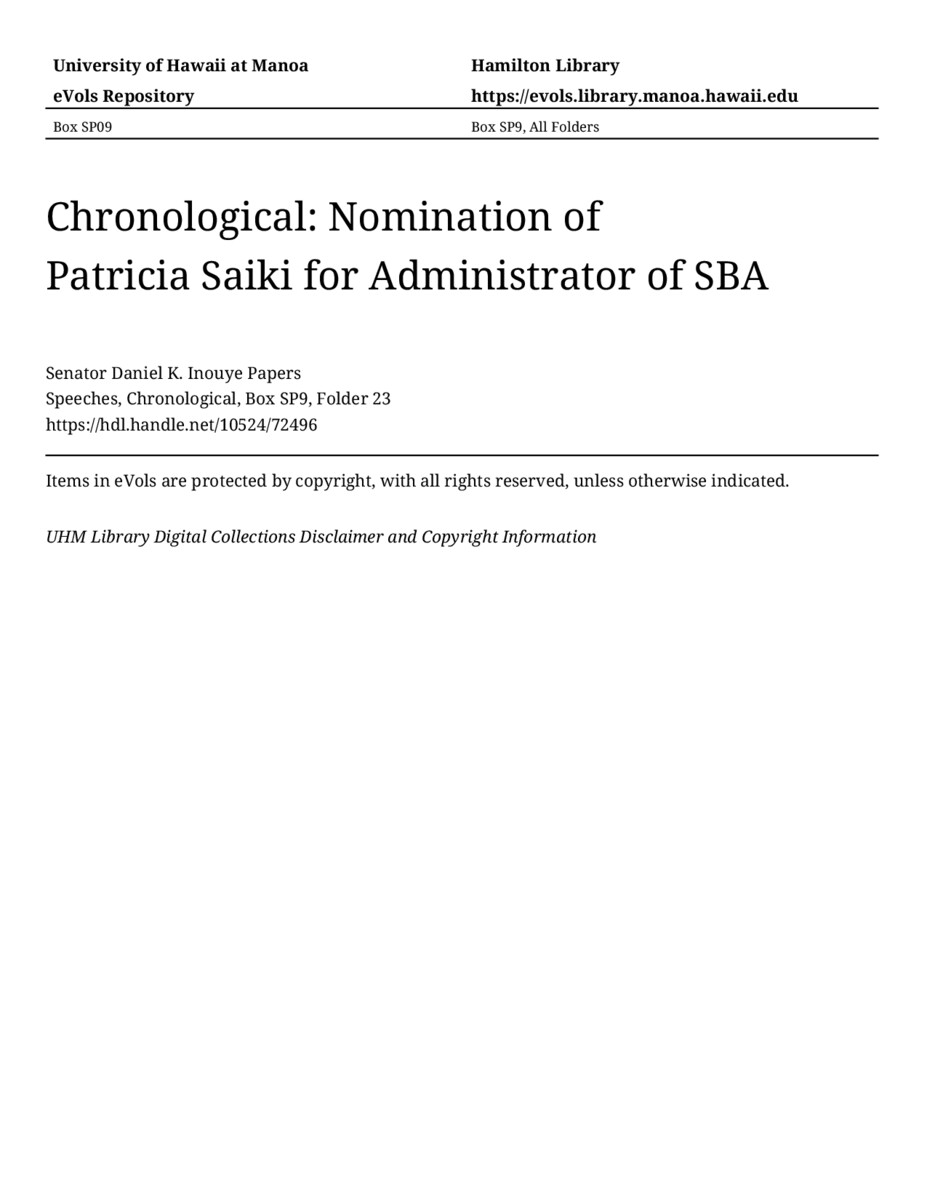 Nomination of Patricia Saiki for Administrator of SBA, March 20, 1991, MANUSCRIPT-HCPC00011, Speeches, Chronological, Box SP9, Folder 23, Senator Daniel K. Inouye Papers, Hawaiʻi Congressional Papers Collection, University of Hawaiʻi at Mānoa Library, Honolulu, HI. https://omekas-congress.lib.wvu.edu/catalog/10524_72496 (accessed April 13, 2026).