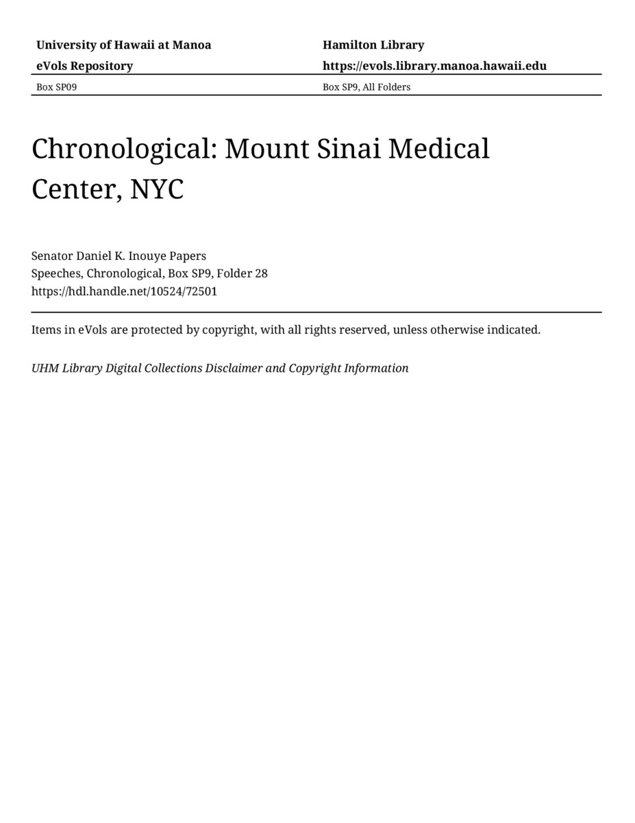 Mount Sinai Medical Center, NYC, May 21, 1991, MANUSCRIPT-HCPC00011, Speeches, Chronological, Box SP9, Folder 28, Senator Daniel K. Inouye Papers, Hawaiʻi Congressional Papers Collection, University of Hawaiʻi at Mānoa Library, Honolulu, HI. https://omekas-congress.lib.wvu.edu/catalog/10524_72501 (accessed April 20, 2026).