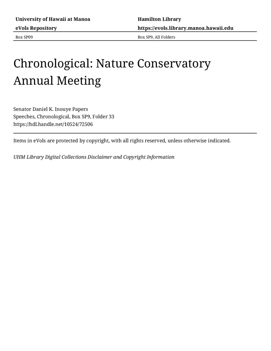 Nature Conservatory Annual Meeting, May 29, 1991, MANUSCRIPT-HCPC00011, Speeches, Chronological, Box SP9, Folder 33, Senator Daniel K. Inouye Papers, Hawaiʻi Congressional Papers Collection, University of Hawaiʻi at Mānoa Library, Honolulu, HI. https://omekas-congress.lib.wvu.edu/catalog/10524_72506 (accessed April 09, 2026).