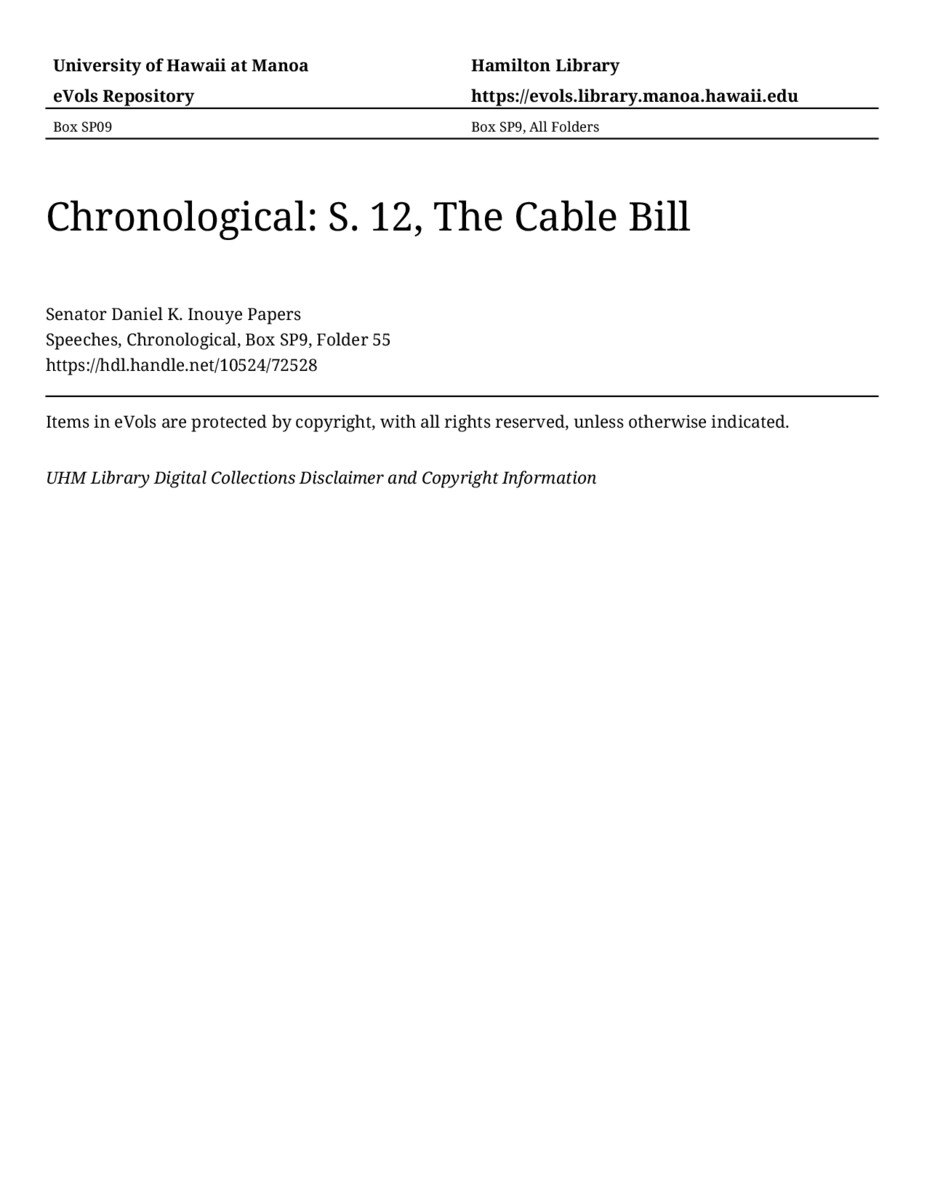S. 12, The Cable Bill, November 7, 1991, MANUSCRIPT-HCPC00011, Speeches, Chronological, Box SP9, Folder 55, Senator Daniel K. Inouye Papers, Hawaiʻi Congressional Papers Collection, University of Hawaiʻi at Mānoa Library, Honolulu, HI. https://omekas-congress.lib.wvu.edu/catalog/10524_72528 (accessed April 09, 2026).