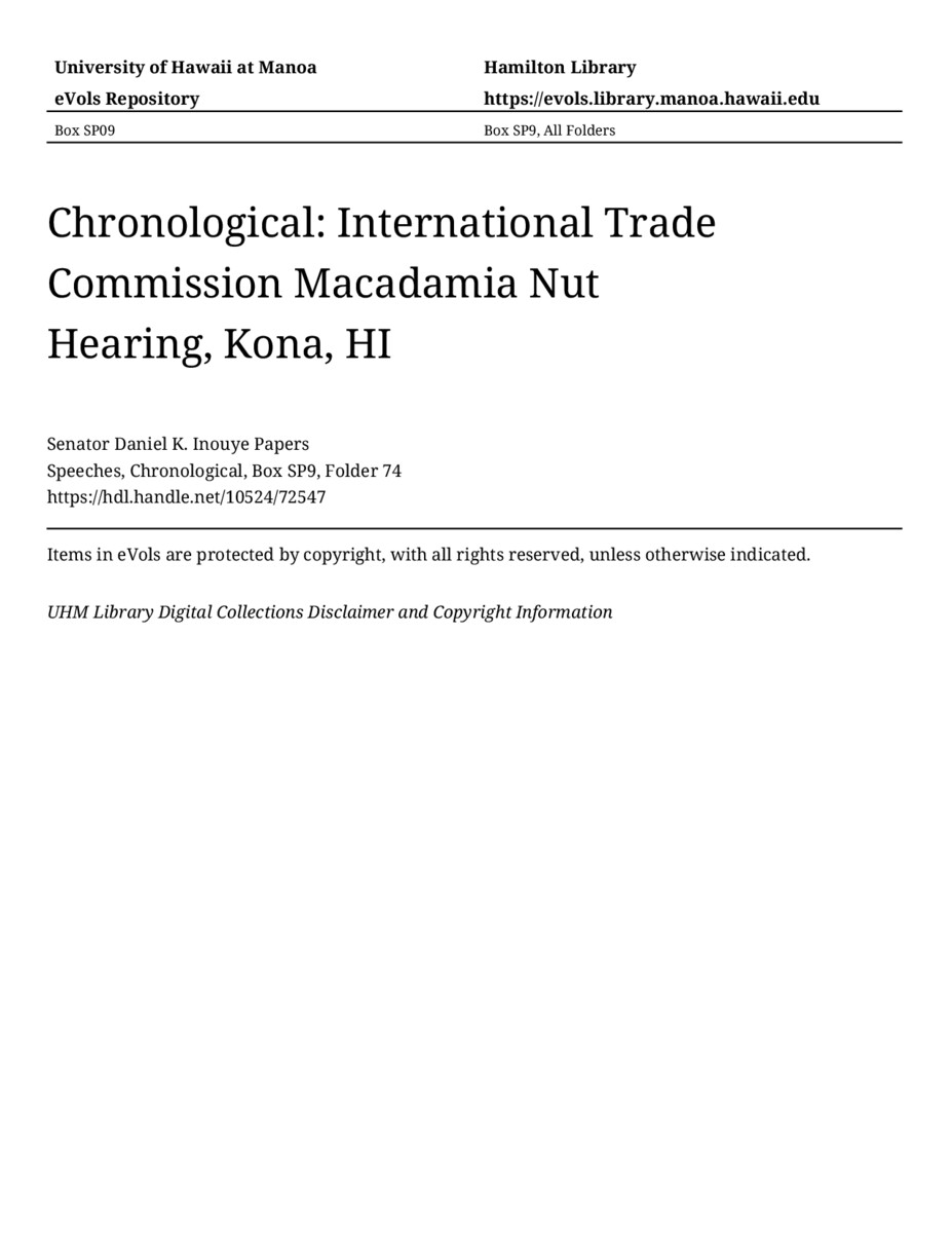 International Trade Commission Macadamia Nut Hearing, Kona, HI, April 22, 1992, MANUSCRIPT-HCPC00011, Speeches, Chronological, Box SP9, Folder 74, Senator Daniel K. Inouye Papers, Hawaiʻi Congressional Papers Collection, University of Hawaiʻi at Mānoa Library, Honolulu, HI. https://omekas-congress.lib.wvu.edu/catalog/10524_72547 (accessed April 10, 2026).