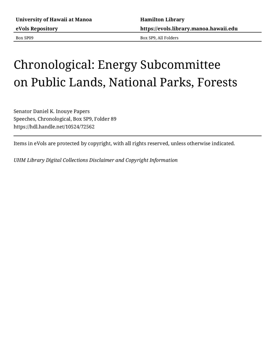Energy Subcommittee on Public Lands, National Parks, Forests, August 6, 1992, MANUSCRIPT-HCPC00011, Speeches, Chronological, Box SP9, Folder 89, Senator Daniel K. Inouye Papers, Hawaiʻi Congressional Papers Collection, University of Hawaiʻi at Mānoa Library, Honolulu, HI. https://omekas-congress.lib.wvu.edu/catalog/10524_72562 (accessed April 21, 2026).