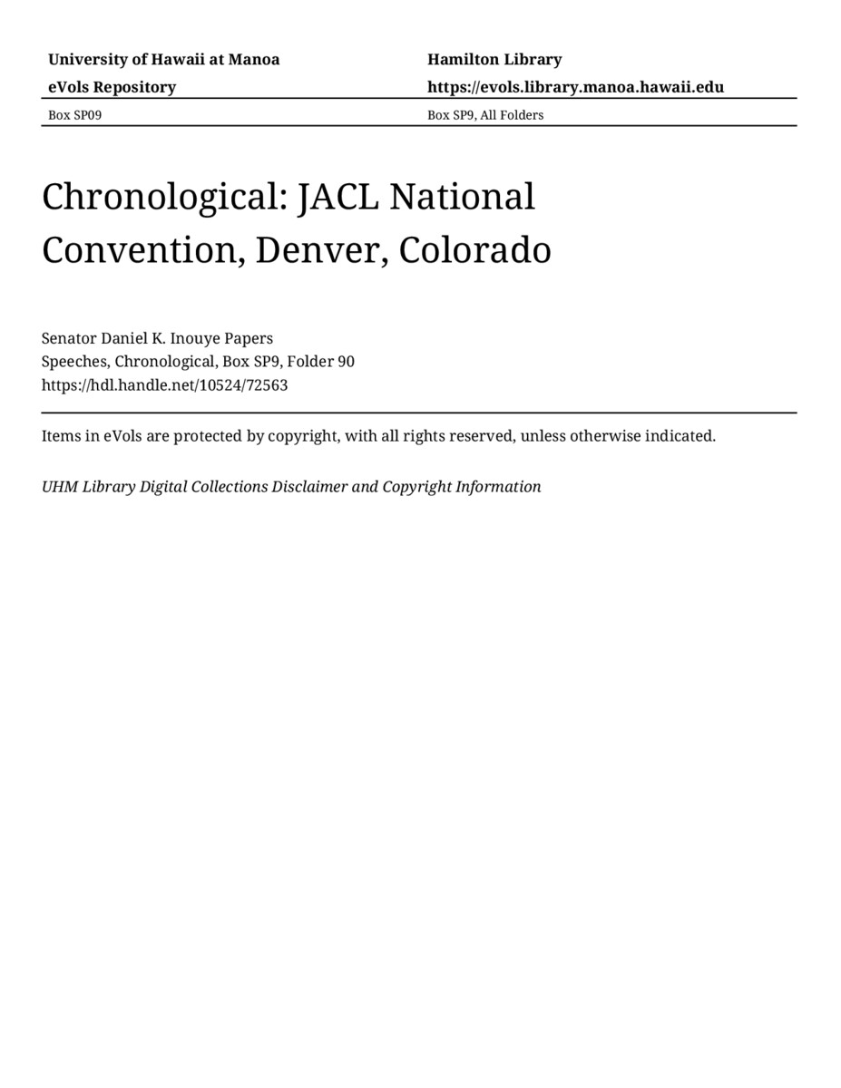 JACL National Convention, Denver, Colorado, August 8, 1992, MANUSCRIPT-HCPC00011, Speeches, Chronological, Box SP9, Folder 90, Senator Daniel K. Inouye Papers, Hawaiʻi Congressional Papers Collection, University of Hawaiʻi at Mānoa Library, Honolulu, HI. https://omekas-congress.lib.wvu.edu/catalog/10524_72563 (accessed April 21, 2026).