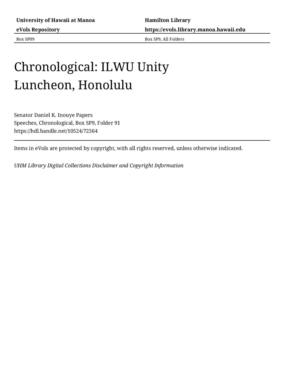 ILWU Unity Luncheon, Honolulu, August 16, 1992, MANUSCRIPT-HCPC00011, Speeches, Chronological, Box SP9, Folder 91, Senator Daniel K. Inouye Papers, Hawaiʻi Congressional Papers Collection, University of Hawaiʻi at Mānoa Library, Honolulu, HI. https://omekas-congress.lib.wvu.edu/catalog/10524_72564 (accessed April 20, 2026).