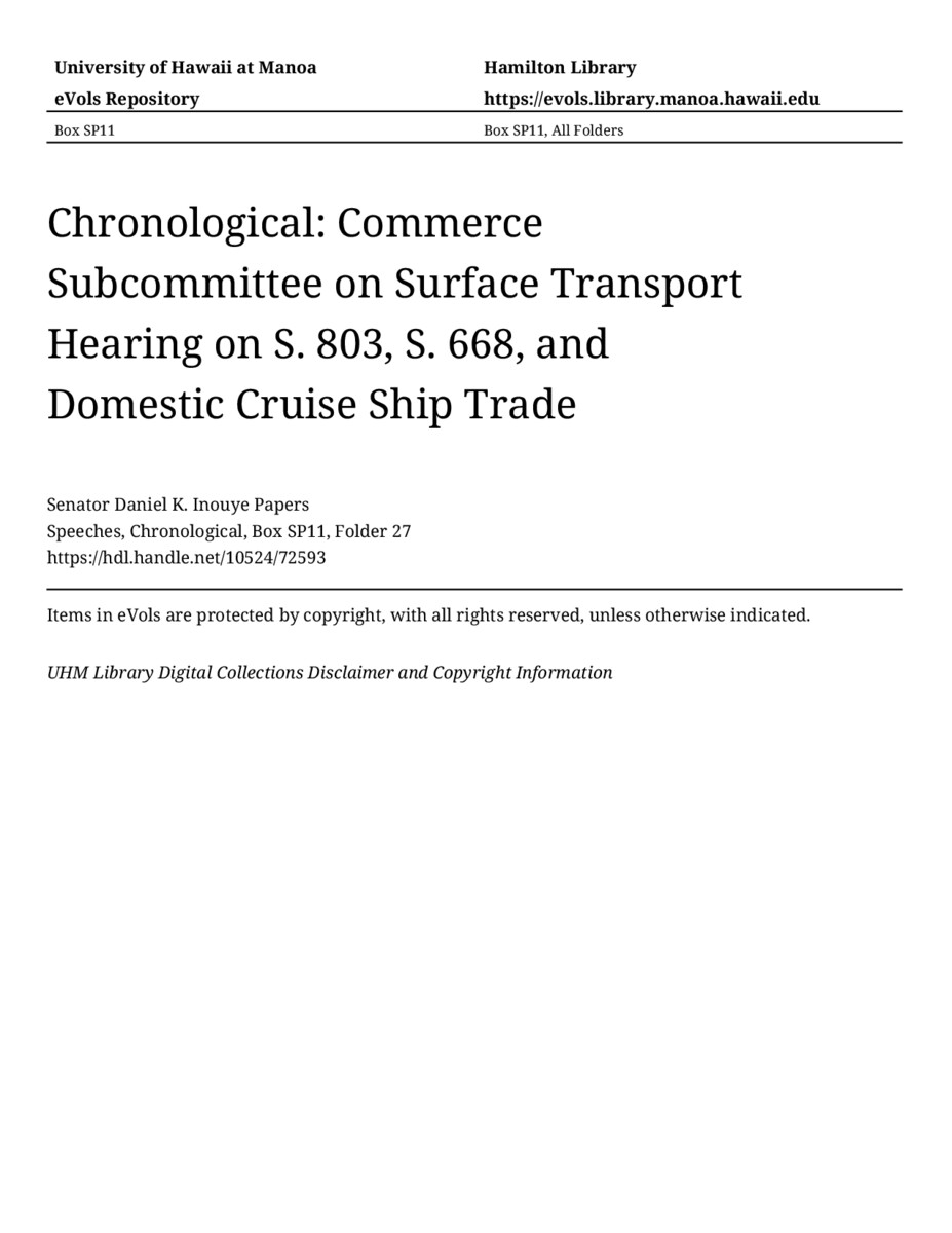 - Commerce Subcommittee on Surface Transport Hearing on S. 803, S. 668, and Domestic Cruise Ship Trade