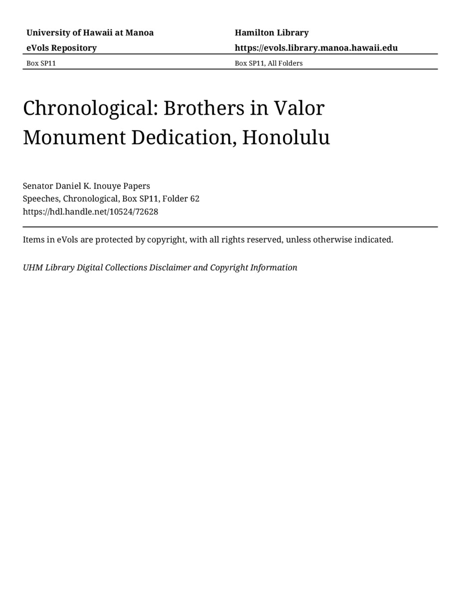 Brothers in Valor Monument Dedication, Honolulu, July 4, 1998, MANUSCRIPT-HCPC00011, Speeches, Chronological, Box SP11, Folder 62, Senator Daniel K. Inouye Papers, Hawaiʻi Congressional Papers Collection, University of Hawaiʻi at Mānoa Library, Honolulu, HI. https://omekas-congress.lib.wvu.edu/catalog/10524_72628 (accessed April 20, 2026).