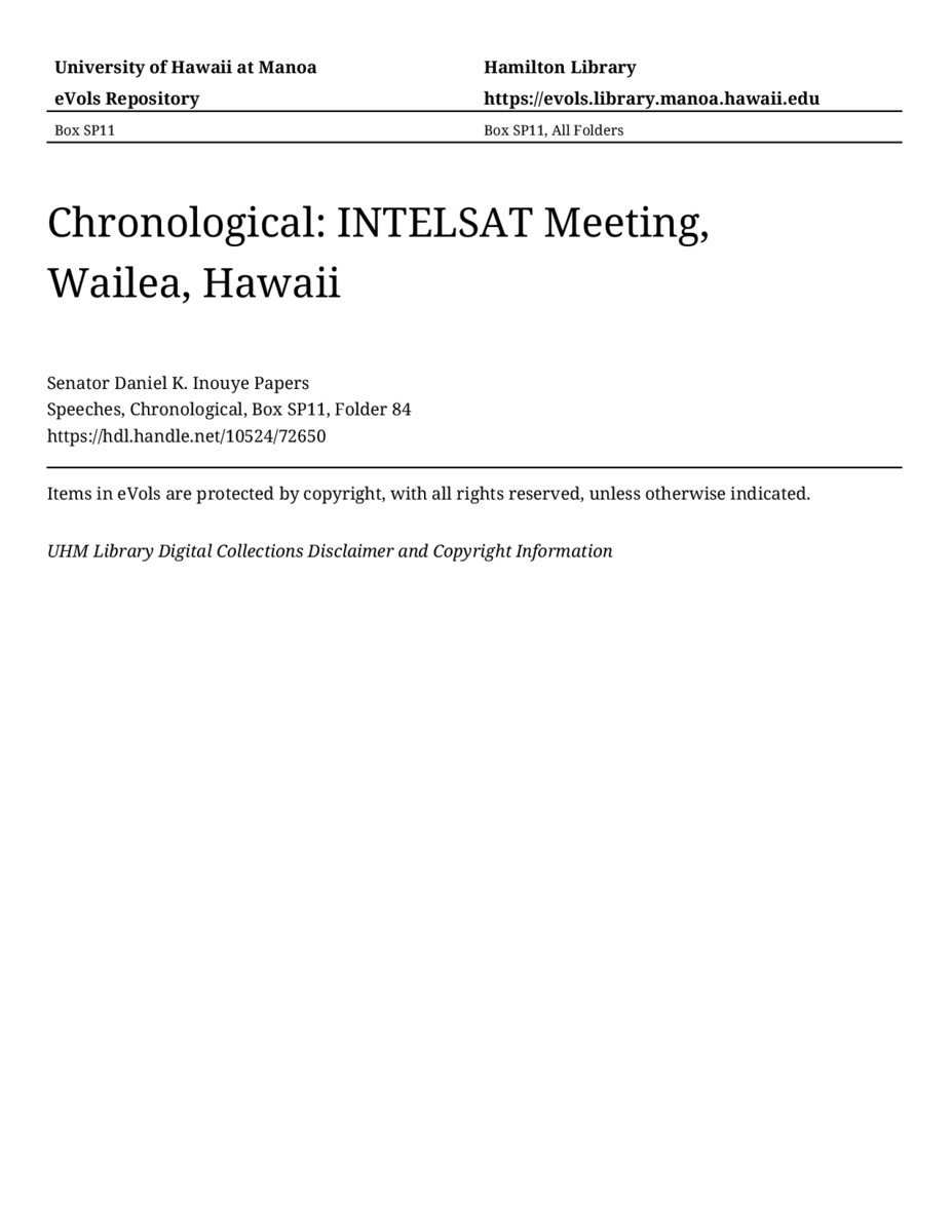 INTELSAT Meeting, Wailea, Hawaii, April 7, 1999, MANUSCRIPT-HCPC00011, Speeches, Chronological, Box SP11, Folder 84, Senator Daniel K. Inouye Papers, Hawaiʻi Congressional Papers Collection, University of Hawaiʻi at Mānoa Library, Honolulu, HI. https://omekas-congress.lib.wvu.edu/catalog/10524_72650 (accessed April 09, 2026).