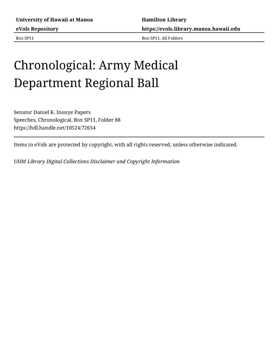Army Medical Department Regional Ball, May 1, 1999, MANUSCRIPT-HCPC00011, Speeches, Chronological, Box SP11, Folder 88, Senator Daniel K. Inouye Papers, Hawaiʻi Congressional Papers Collection, University of Hawaiʻi at Mānoa Library, Honolulu, HI. https://omekas-congress.lib.wvu.edu/catalog/10524_72654 (accessed April 17, 2026).