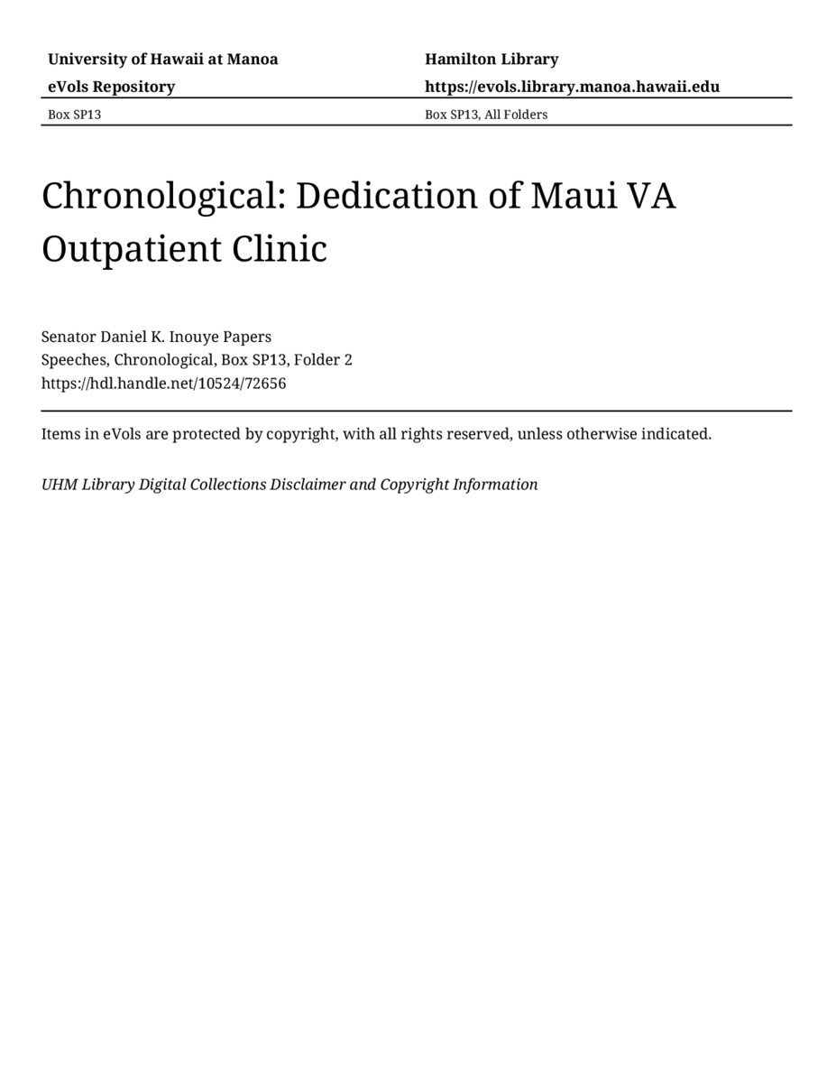 Dedication of Maui VA Outpatient Clinic, January 7, 2002, MANUSCRIPT-HCPC00011, Speeches, Chronological, Box SP13, Folder 2, Senator Daniel K. Inouye Papers, Hawaiʻi Congressional Papers Collection, University of Hawaiʻi at Mānoa Library, Honolulu, HI. https://omekas-congress.lib.wvu.edu/catalog/10524_72656 (accessed April 21, 2026).