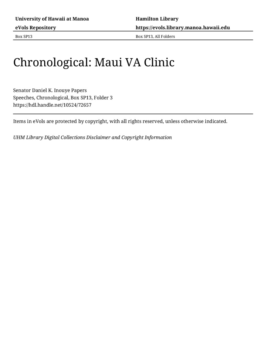 Maui VA Clinic, January 7, 2002, MANUSCRIPT-HCPC00011, Speeches, Chronological, Box SP13, Folder 3, Senator Daniel K. Inouye Papers, Hawaiʻi Congressional Papers Collection, University of Hawaiʻi at Mānoa Library, Honolulu, HI. https://omekas-congress.lib.wvu.edu/catalog/10524_72657 (accessed April 21, 2026).
