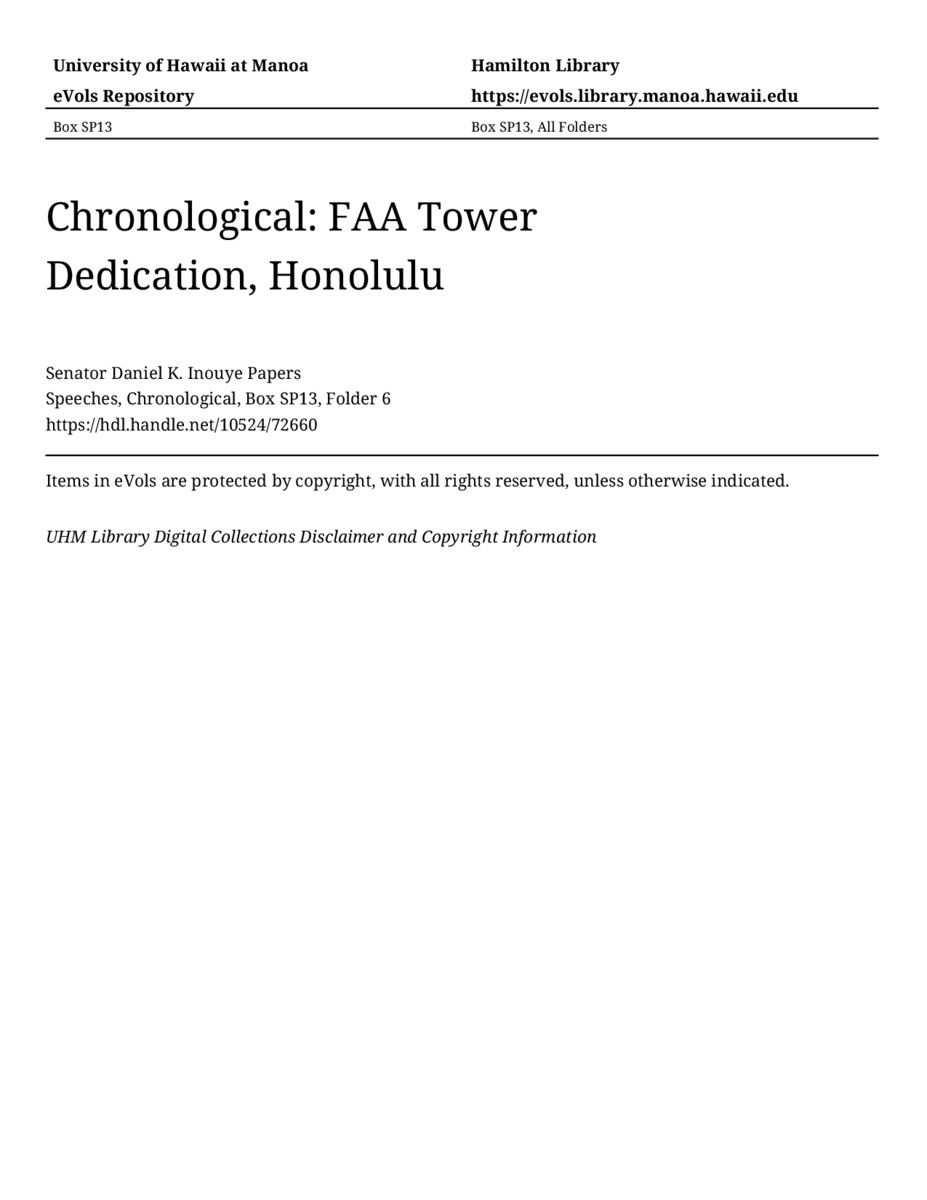 FAA Tower Dedication, Honolulu, January 11, 2002, MANUSCRIPT-HCPC00011, Speeches, Chronological, Box SP13, Folder 6, Senator Daniel K. Inouye Papers, Hawaiʻi Congressional Papers Collection, University of Hawaiʻi at Mānoa Library, Honolulu, HI. https://omekas-congress.lib.wvu.edu/catalog/10524_72660 (accessed April 19, 2026).