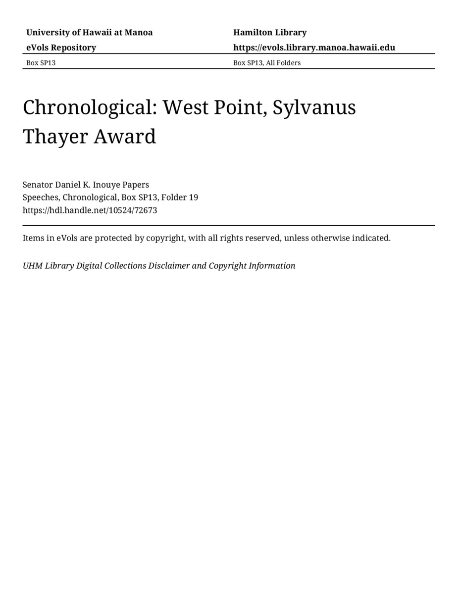 West Point, Sylvanus Thayer Award, April 18, 2002, MANUSCRIPT-HCPC00011, Speeches, Chronological, Box SP13, Folder 19, Senator Daniel K. Inouye Papers, Hawaiʻi Congressional Papers Collection, University of Hawaiʻi at Mānoa Library, Honolulu, HI. https://omekas-congress.lib.wvu.edu/catalog/10524_72673 (accessed April 17, 2026).