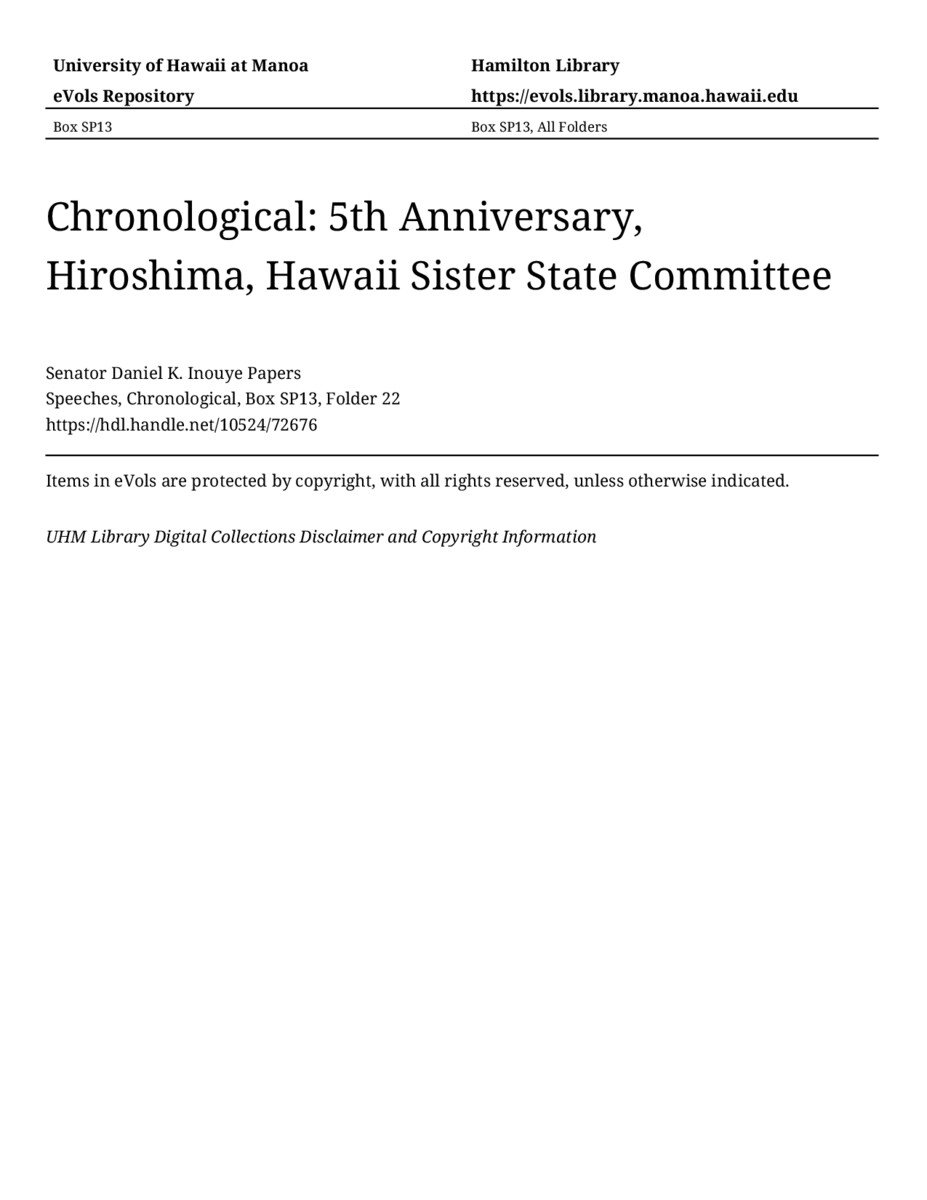 5th Anniversary, Hiroshima, Hawaii Sister State Committee, May 2002, MANUSCRIPT-HCPC00011, Speeches, Chronological, Box SP13, Folder 22, Senator Daniel K. Inouye Papers, Hawaiʻi Congressional Papers Collection, University of Hawaiʻi at Mānoa Library, Honolulu, HI. https://omekas-congress.lib.wvu.edu/catalog/10524_72676 (accessed April 17, 2026).