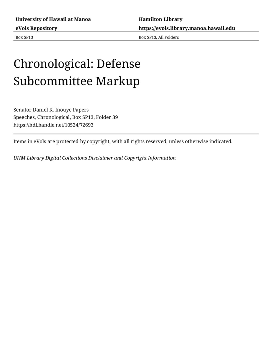 Defense Subcommittee Markup, July 16, 2002, MANUSCRIPT-HCPC00011, Speeches, Chronological, Box SP13, Folder 39, Senator Daniel K. Inouye Papers, Hawaiʻi Congressional Papers Collection, University of Hawaiʻi at Mānoa Library, Honolulu, HI. https://omekas-congress.lib.wvu.edu/catalog/10524_72693 (accessed April 21, 2026).