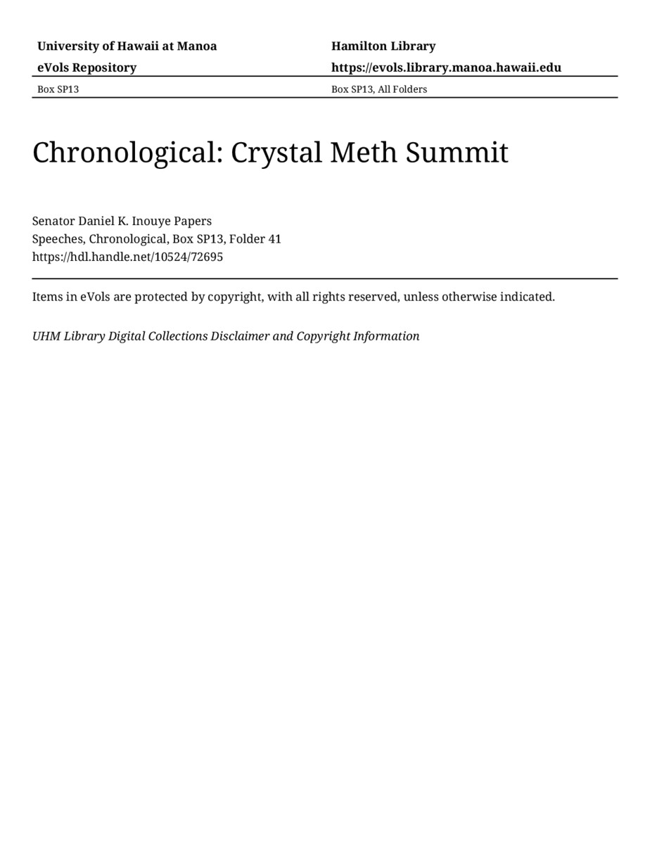 Crystal Meth Summit, August 27, 2002, MANUSCRIPT-HCPC00011, Speeches, Chronological, Box SP13, Folder 41, Senator Daniel K. Inouye Papers, Hawaiʻi Congressional Papers Collection, University of Hawaiʻi at Mānoa Library, Honolulu, HI. https://omekas-congress.lib.wvu.edu/catalog/10524_72695 (accessed April 23, 2026).