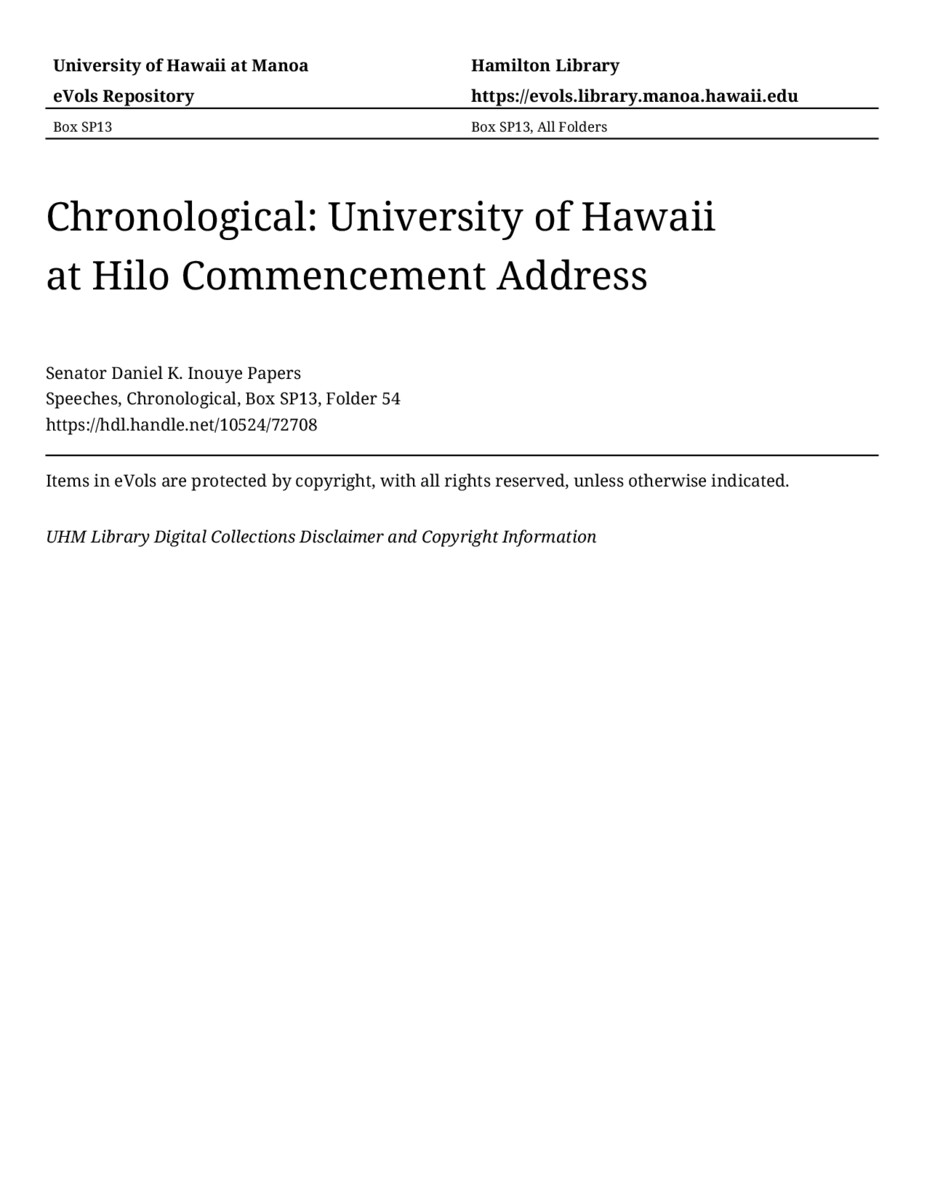 University of Hawaii at Hilo Commencement Address, May 17, 2003, MANUSCRIPT-HCPC00011, Speeches, Chronological, Box SP13, Folder 54, Senator Daniel K. Inouye Papers, Hawaiʻi Congressional Papers Collection, University of Hawaiʻi at Mānoa Library, Honolulu, HI. https://omekas-congress.lib.wvu.edu/catalog/10524_72708 (accessed April 18, 2026).