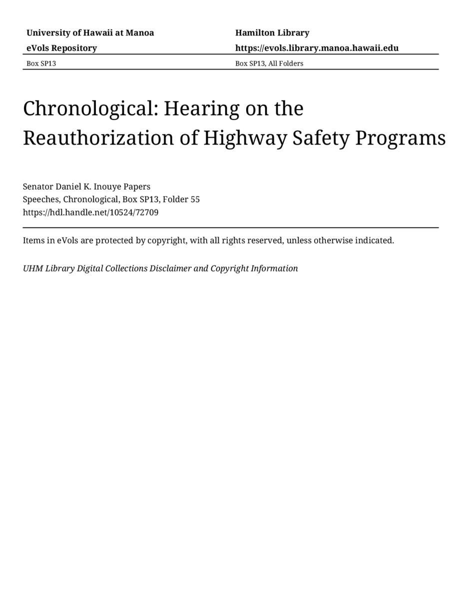 Hearing on the Reauthorization of Highway Safety Programs, May 21, 2003, MANUSCRIPT-HCPC00011, Speeches, Chronological, Box SP13, Folder 55, Senator Daniel K. Inouye Papers, Hawaiʻi Congressional Papers Collection, University of Hawaiʻi at Mānoa Library, Honolulu, HI. https://omekas-congress.lib.wvu.edu/catalog/10524_72709 (accessed April 18, 2026).