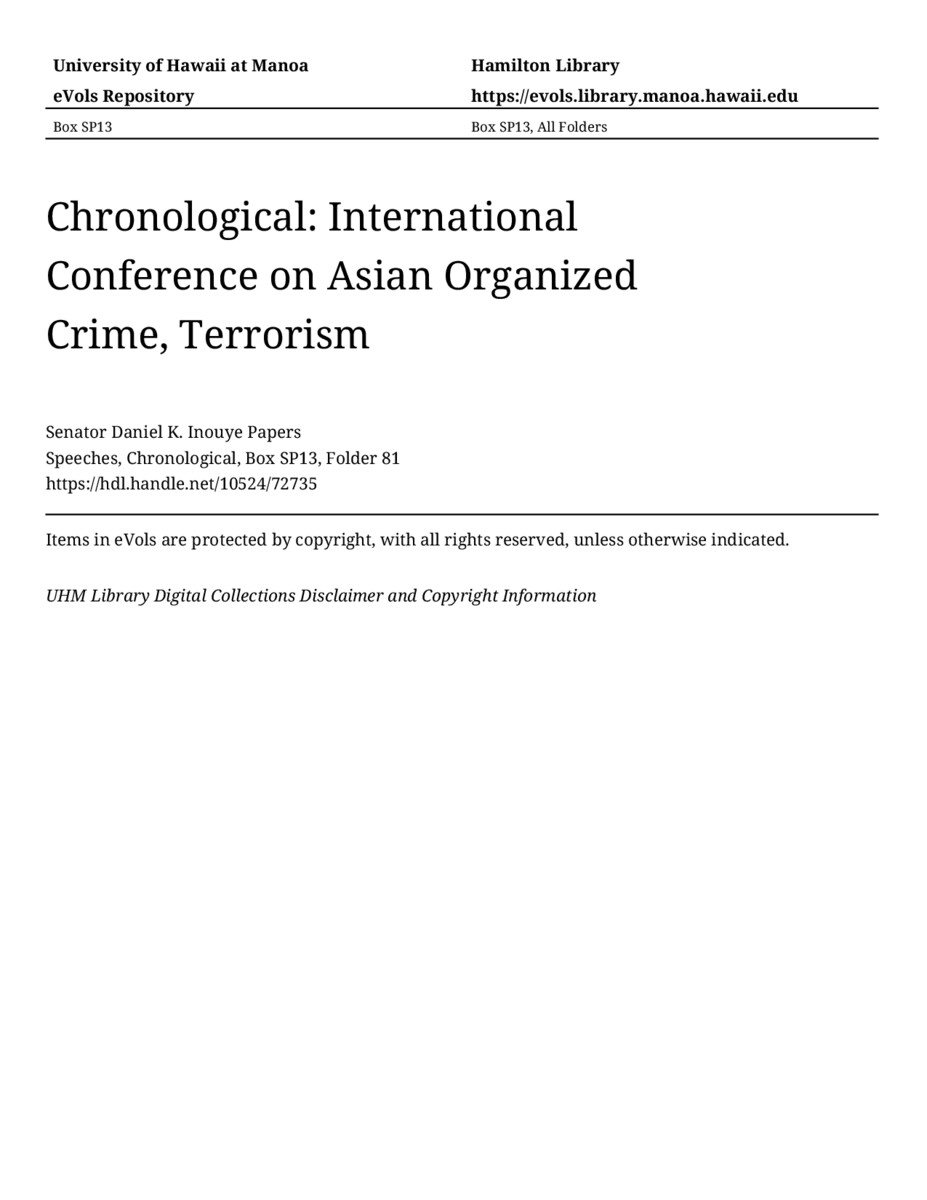 International Conference on Asian Organized Crime, Terrorism, April 12, 2004, MANUSCRIPT-HCPC00011, Speeches, Chronological, Box SP13, Folder 81, Senator Daniel K. Inouye Papers, Hawaiʻi Congressional Papers Collection, University of Hawaiʻi at Mānoa Library, Honolulu, HI. https://omekas-congress.lib.wvu.edu/catalog/10524_72735 (accessed April 21, 2026).