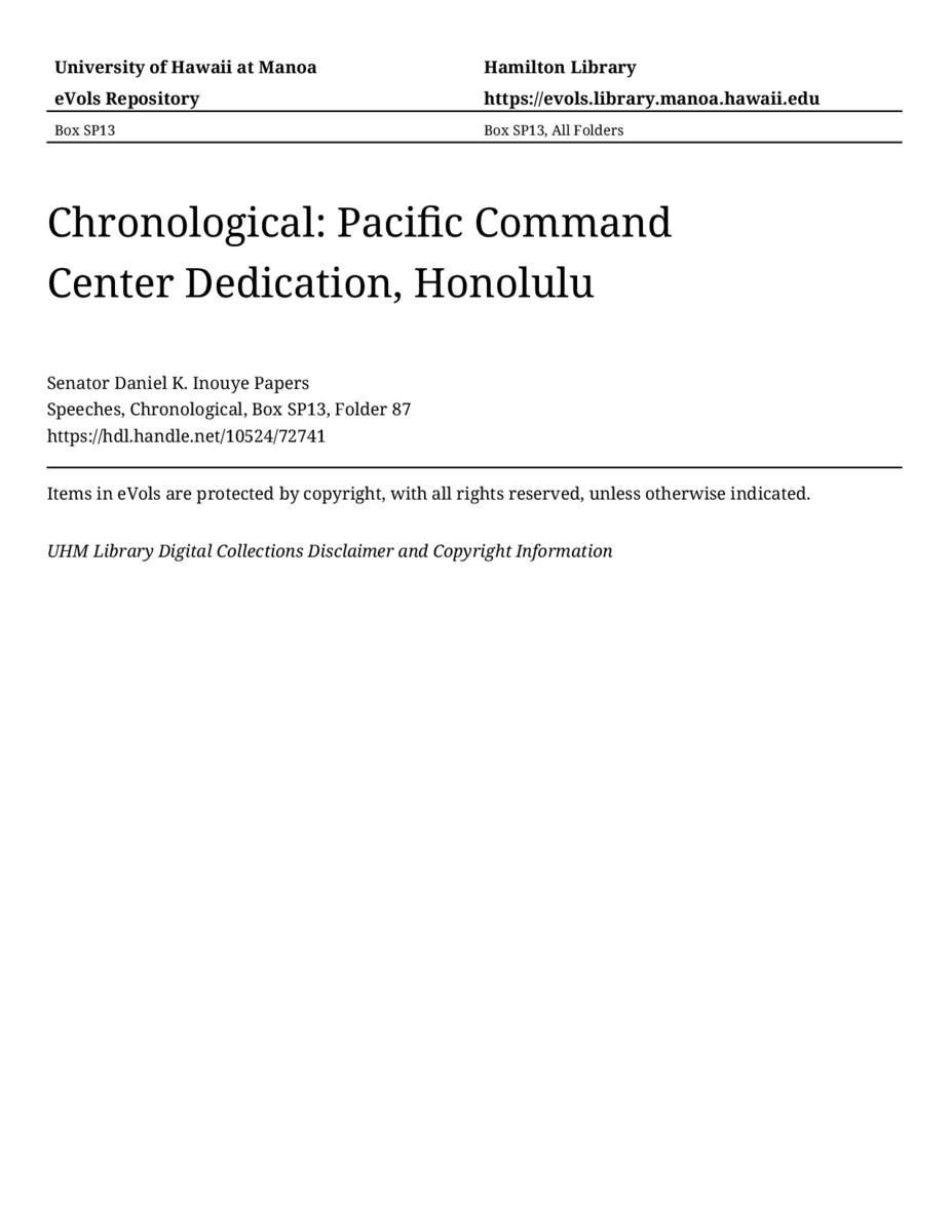 Pacific Command Center Dedication, Honolulu, April 14, 2004, MANUSCRIPT-HCPC00011, Speeches, Chronological, Box SP13, Folder 87, Senator Daniel K. Inouye Papers, Hawaiʻi Congressional Papers Collection, University of Hawaiʻi at Mānoa Library, Honolulu, HI. https://omekas-congress.lib.wvu.edu/catalog/10524_72741 (accessed April 21, 2026).