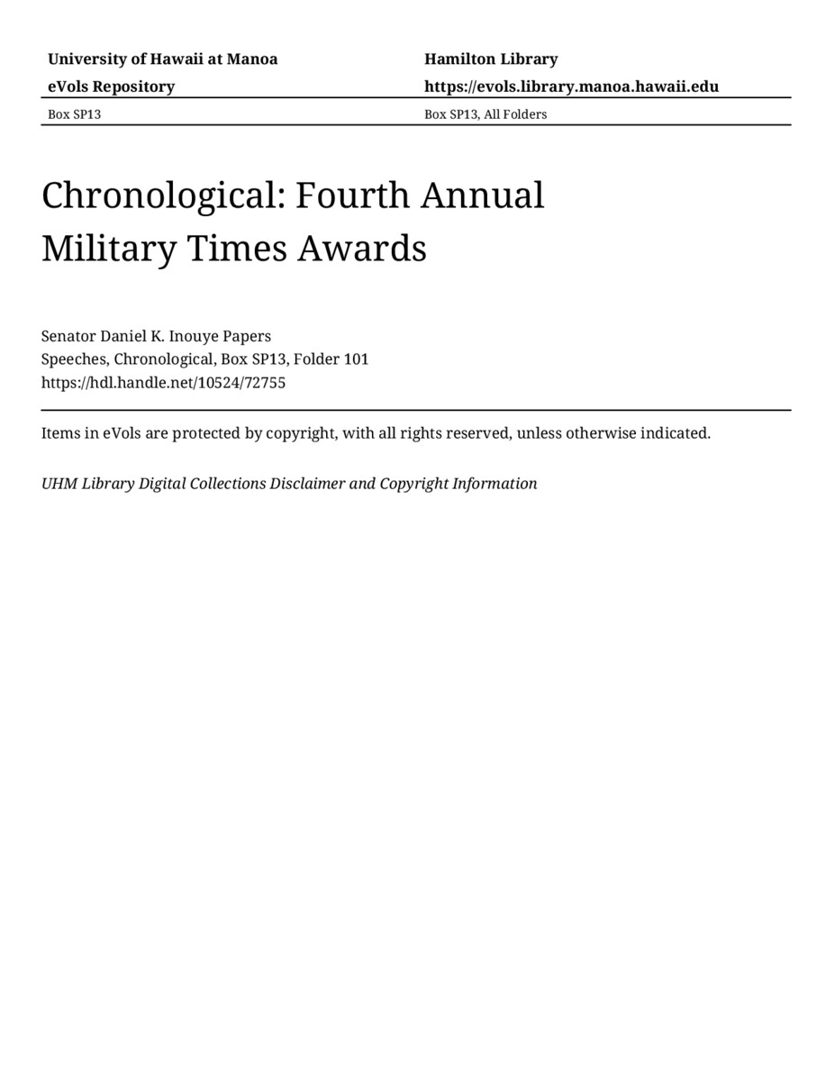 Fourth Annual Military Times Awards, July 8, 2004, MANUSCRIPT-HCPC00011, Speeches, Chronological, Box SP13, Folder 101, Senator Daniel K. Inouye Papers, Hawaiʻi Congressional Papers Collection, University of Hawaiʻi at Mānoa Library, Honolulu, HI. https://omekas-congress.lib.wvu.edu/catalog/10524_72755 (accessed April 21, 2026).