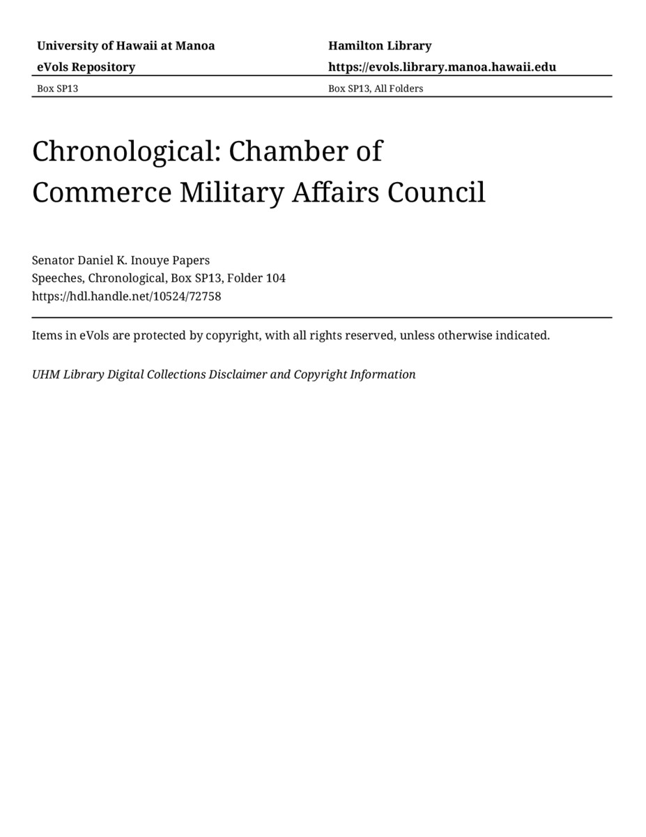 Chamber of Commerce Military Affairs Council, August 12, 2004, MANUSCRIPT-HCPC00011, Speeches, Chronological, Box SP13, Folder 104, Senator Daniel K. Inouye Papers, Hawaiʻi Congressional Papers Collection, University of Hawaiʻi at Mānoa Library, Honolulu, HI. https://omekas-congress.lib.wvu.edu/catalog/10524_72758 (accessed April 27, 2026).