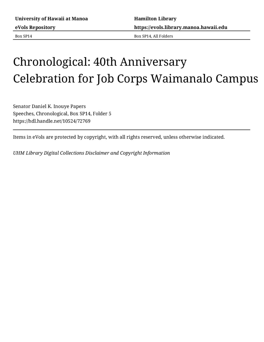 40th Anniversary Celebration for Job Corps Waimanalo Campus, August 16, 2004, MANUSCRIPT-HCPC00011, Speeches, Chronological, Box SP14, Folder 5, Senator Daniel K. Inouye Papers, Hawaiʻi Congressional Papers Collection, University of Hawaiʻi at Mānoa Library, Honolulu, HI. https://omekas-congress.lib.wvu.edu/catalog/10524_72769 (accessed April 21, 2026).