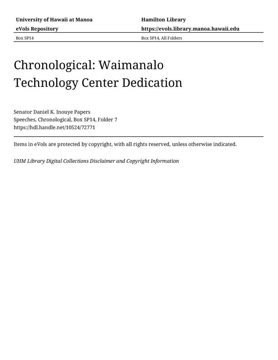 Waimanalo Technology Center Dedication, August 16, 2004, MANUSCRIPT-HCPC00011, Speeches, Chronological, Box SP14, Folder 7, Senator Daniel K. Inouye Papers, Hawaiʻi Congressional Papers Collection, University of Hawaiʻi at Mānoa Library, Honolulu, HI. https://omekas-congress.lib.wvu.edu/catalog/10524_72771 (accessed April 09, 2026).