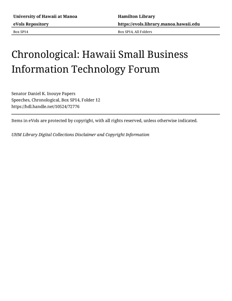Hawaii Small Business Information Technology Forum, August 19, 2004, MANUSCRIPT-HCPC00011, Speeches, Chronological, Box SP14, Folder 12, Senator Daniel K. Inouye Papers, Hawaiʻi Congressional Papers Collection, University of Hawaiʻi at Mānoa Library, Honolulu, HI. https://omekas-congress.lib.wvu.edu/catalog/10524_72776 (accessed April 09, 2026).