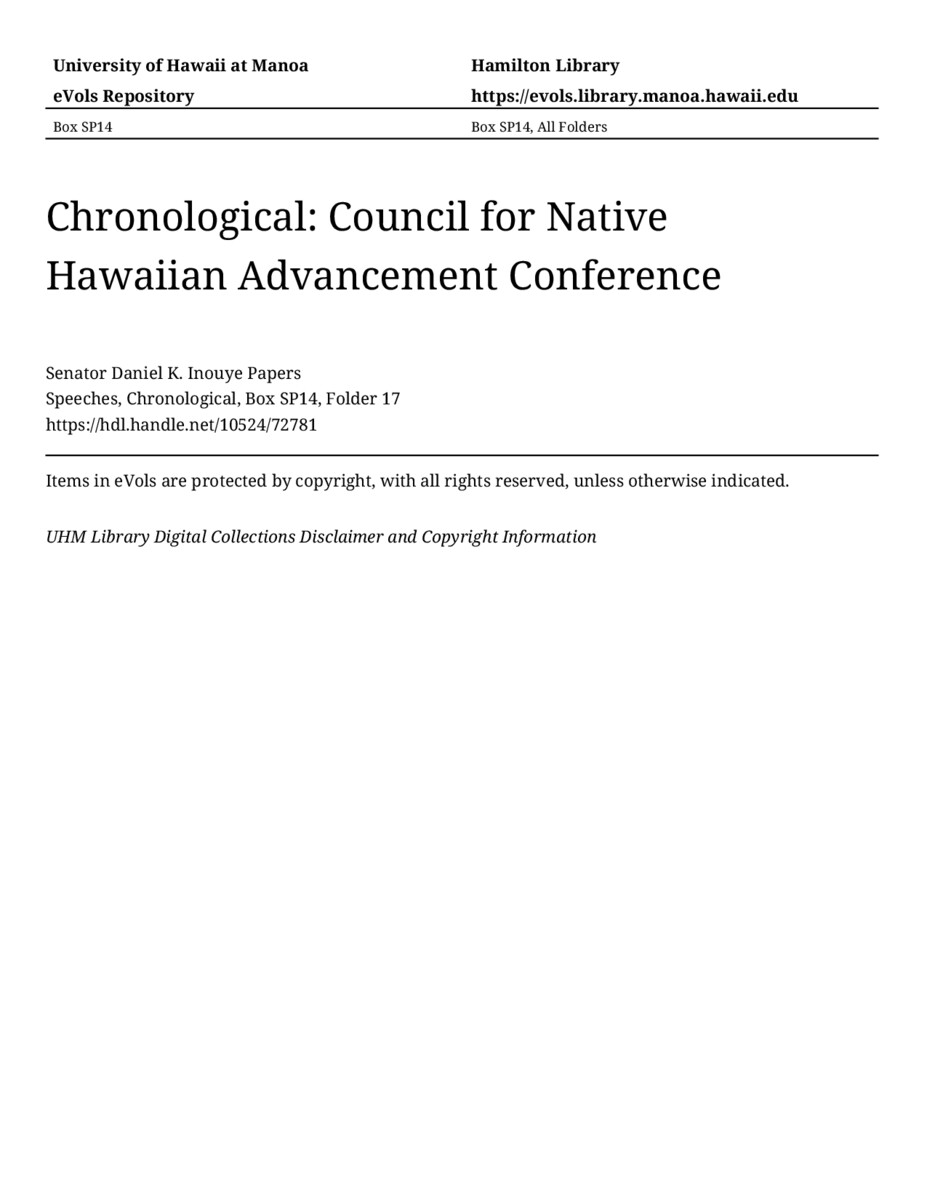 Council for Native Hawaiian Advancement Conference, September 3, 2004, MANUSCRIPT-HCPC00011, Speeches, Chronological, Box SP14, Folder 17, Senator Daniel K. Inouye Papers, Hawaiʻi Congressional Papers Collection, University of Hawaiʻi at Mānoa Library, Honolulu, HI. https://omekas-congress.lib.wvu.edu/catalog/10524_72781 (accessed April 11, 2026).