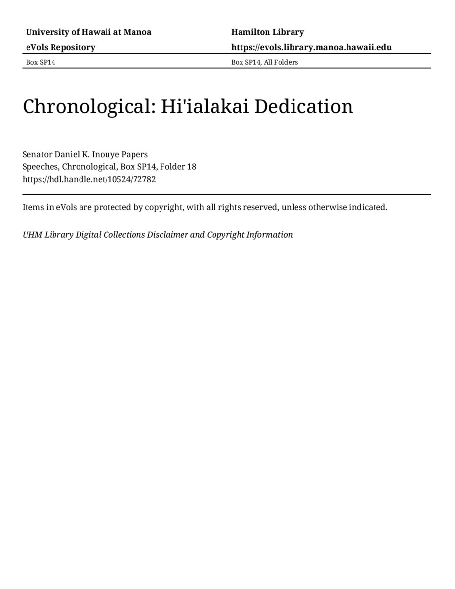 Hi'ialakai Dedication, September 3, 2004, MANUSCRIPT-HCPC00011, Speeches, Chronological, Box SP14, Folder 18, Senator Daniel K. Inouye Papers, Hawaiʻi Congressional Papers Collection, University of Hawaiʻi at Mānoa Library, Honolulu, HI. https://omekas-congress.lib.wvu.edu/catalog/10524_72782 (accessed April 18, 2026).