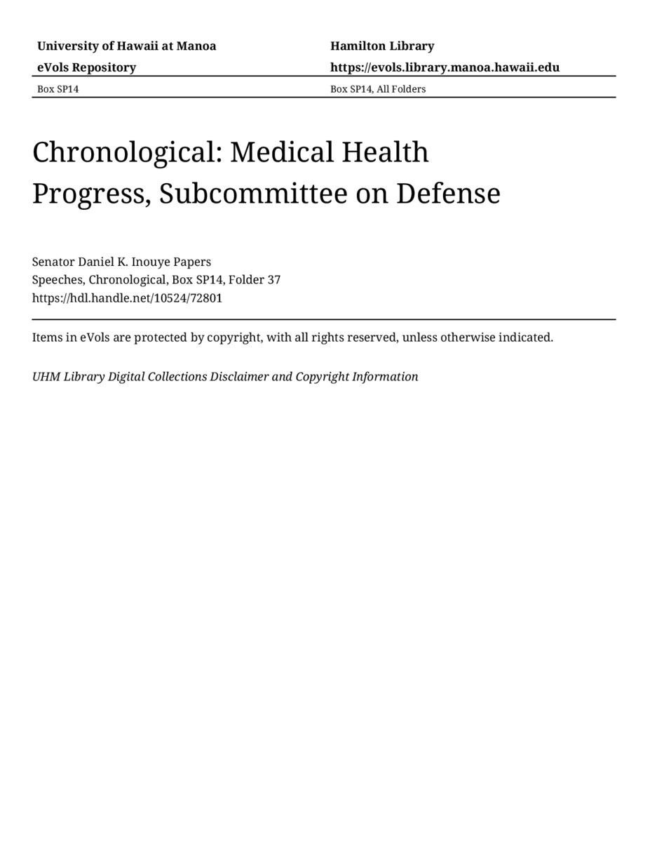 Medical Health Progress, Subcommittee on Defense, May 10, 2005, MANUSCRIPT-HCPC00011, Speeches, Chronological, Box SP14, Folder 37, Senator Daniel K. Inouye Papers, Hawaiʻi Congressional Papers Collection, University of Hawaiʻi at Mānoa Library, Honolulu, HI. https://omekas-congress.lib.wvu.edu/catalog/10524_72801 (accessed April 18, 2026).
