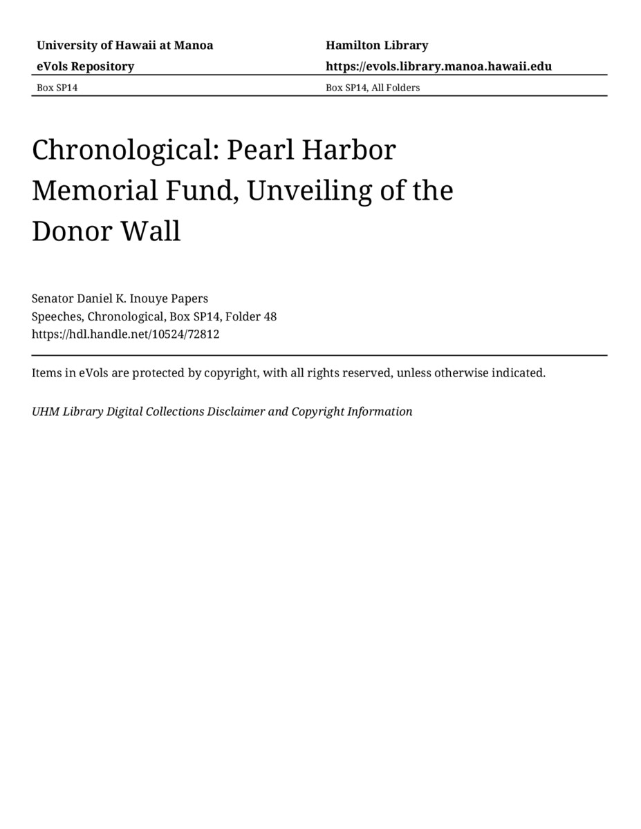 Pearl Harbor Memorial Fund, Unveiling of the Donor Wall, December 6, 2005, MANUSCRIPT-HCPC00011, Speeches, Chronological, Box SP14, Folder 48, Senator Daniel K. Inouye Papers, Hawaiʻi Congressional Papers Collection, University of Hawaiʻi at Mānoa Library, Honolulu, HI. https://omekas-congress.lib.wvu.edu/catalog/10524_72812 (accessed April 18, 2026).