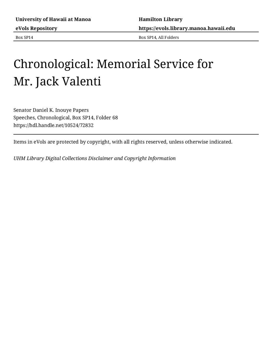 Memorial Service for Mr. Jack Valenti, May 1, 2007, MANUSCRIPT-HCPC00011, Speeches, Chronological, Box SP14, Folder 68, Senator Daniel K. Inouye Papers, Hawaiʻi Congressional Papers Collection, University of Hawaiʻi at Mānoa Library, Honolulu, HI. https://omekas-congress.lib.wvu.edu/catalog/10524_72832 (accessed April 17, 2026).